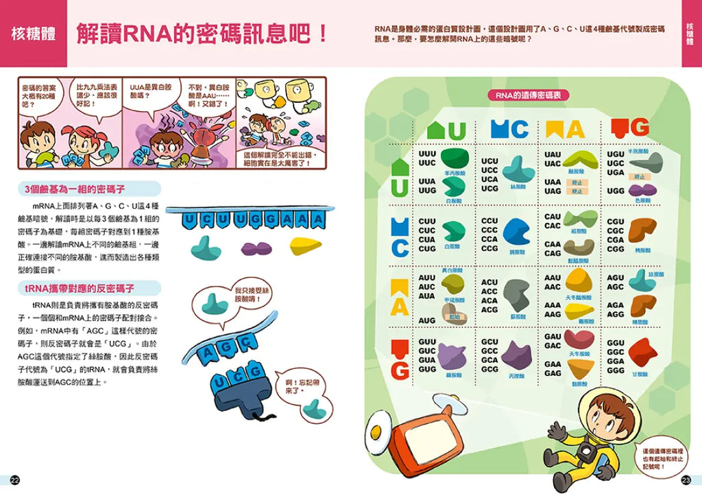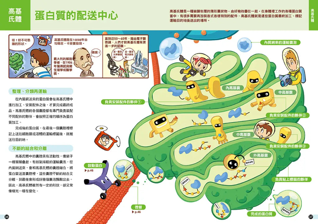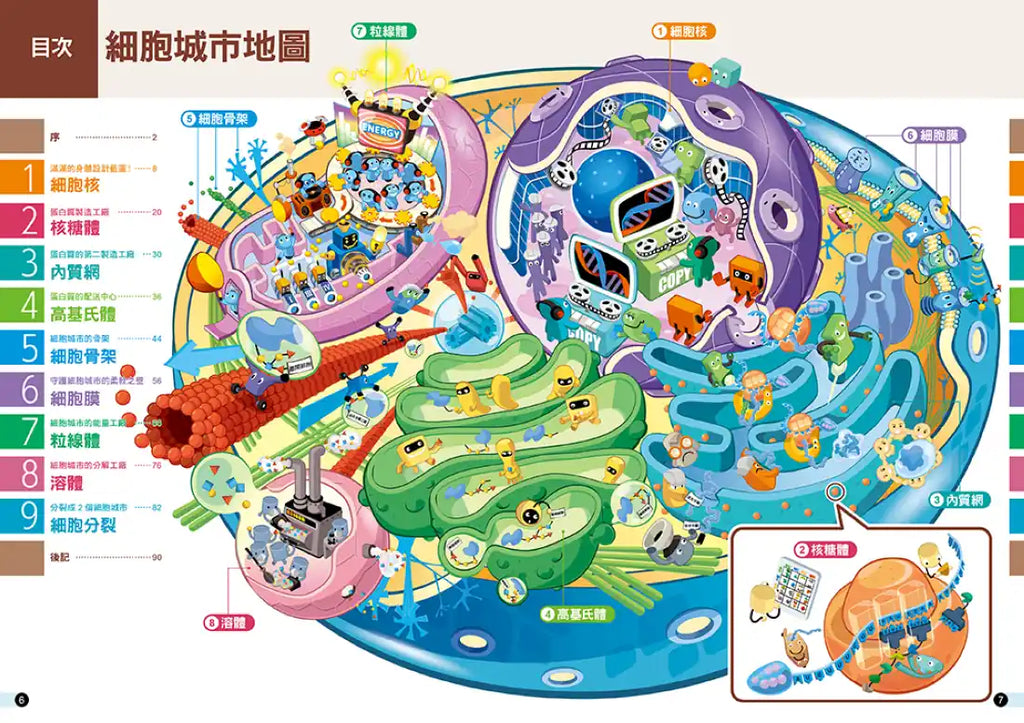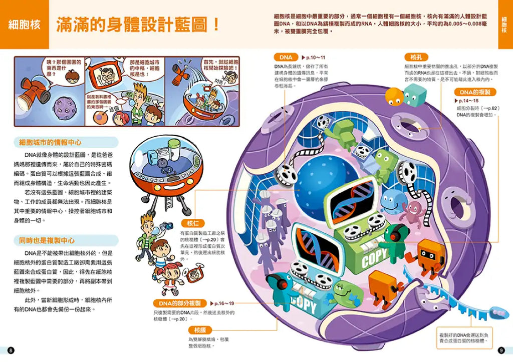 用繽紛的插圖代替複雜的科學用語,巧妙呈現無法以肉眼直接觀察的細胞現象,圖解不易理解的知識,讓抽象的細胞結構和功能更容易理解與記憶。