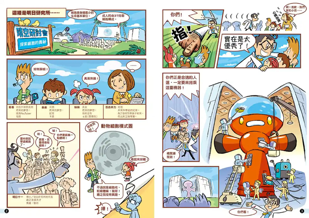 「各位讀者大家好,歡迎搭乘『劍玉1號』機器人,來一場人體大奇航!我們即將進入人體細胞中探險,親眼見證細胞運作的各種機制,探索細胞的奧祕,請繫好安全帶,我們準備出發嘍!」