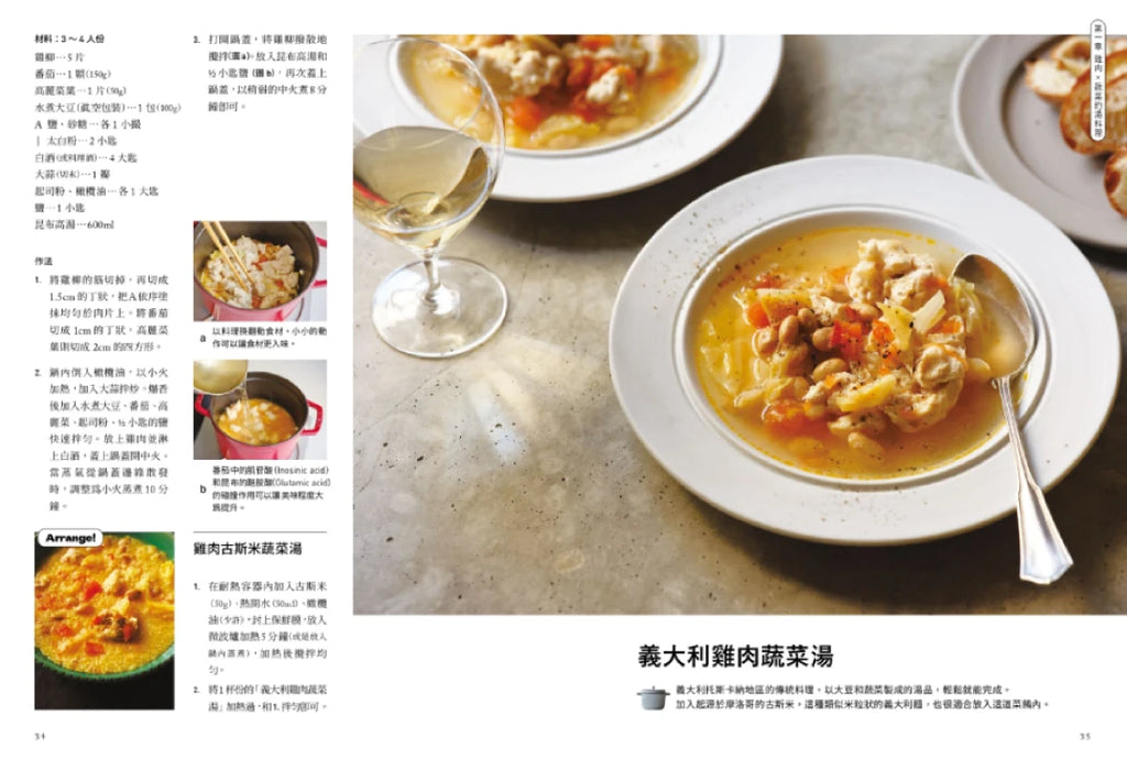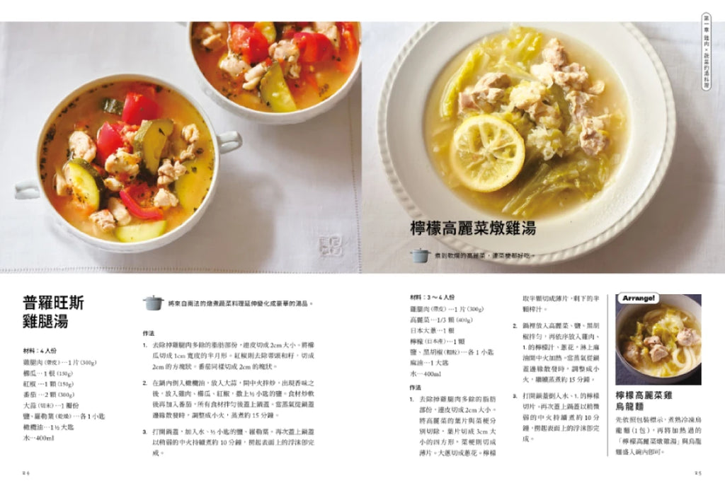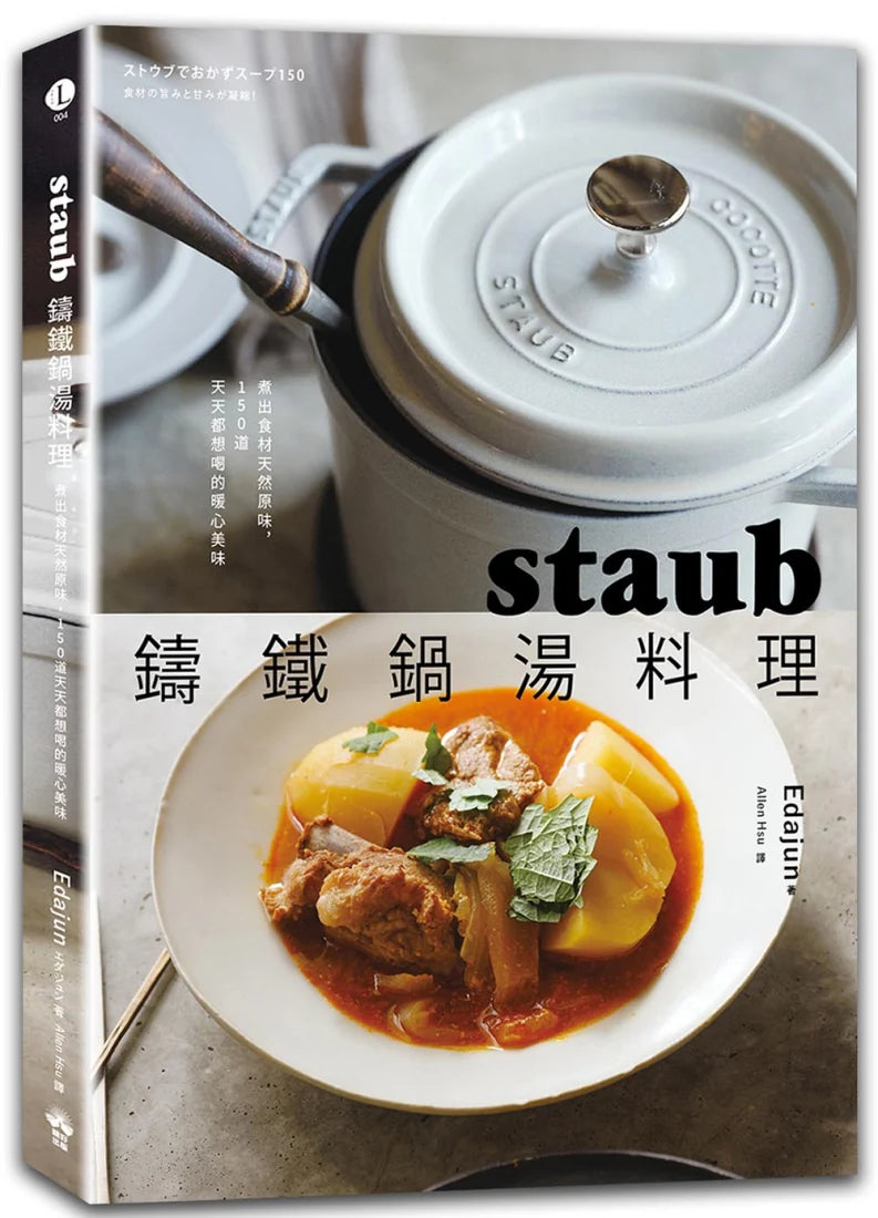 ────零廚藝也能成功煮出美味「湯料理」──── ✦一鍋到底!切、煮、調味三步驟,鑄鐵鍋煮湯快速省時✦ ✦百喝不膩!150道各國道地湯品,湯色多變美味上桌✦ 料理研究家不藏私的美味訣竅大公開   ────|鑄鐵鍋是煮湯美味升級的秘密武器|──── 鑄鐵鍋讓食材的鮮美成分高度封存,就能將食材的原味保存,最適合拿來煮湯的一款鍋具。湯裡匯集了大量的蔬菜美味,從蔬菜釋放出的溫和鮮甜融入湯裡。蓋上鍋蓋將肉塊煮到微微沸騰,肉質會出乎意料地軟嫩,而熬煮就是美味的湯頭。將各種食材的鮮美程度,互相堆疊加乘的料理,重點在於利用鹽或調味料,將肉、魚或蔬菜本身的味道釋放出來。 ────|成為湯料理達人的基礎湯底|──── 想煮出美味的湯,你不能錯過的三種基礎湯底: ✦和風高湯─以昆布和柴魚熬製而成的和風高湯湯底。 ✦昆布高湯─只用昆布做出的清爽口味高湯,適合當成各種湯品的湯底。 ✦自製雞高湯─中式、韓式湯料理不可或缺的雞高湯,自己煮風味更佳。鍋內放入洋蔥、紅蘿蔔、大蒜與鹽混勻,再將雞肉放置其上,不使用高湯,僅以鹽與胡椒調味。   ────| 不能錯過各國風味的美味湯料理 |──── 日式、中式、韓式或是各種異國風風味的湯品統統收錄。湯品料理也可以繽紛百變,每天吃都不會膩。將湯品加上麵或飯,善用不同的巧思延伸變化出不同的料理,以及適合搭配湯品的醃製蔬菜或是沙拉食譜,日式味噌湯的各種變化版本,應急用的乾貨或是保存食品做成的湯品也都一一介紹。 <<<<<<<雞肉×蔬菜湯料理>>>>>>> 煎到金黃焦脆的雞腿肉、燉煮到軟嫩的雞胸肉、可以熬出鮮美湯頭的雞翅,使用這些富含高蛋白質營養的雞肉,煮出的各種創意湯料理。 ✦雞肉蕃茄無水湯料理─僅運用番茄的水分製成的鮮紅色湯料理,雞肉與番茄的鮮甜濃縮其中,滋味絕佳! ✦冬季白菜燉雞腿湯─在冬季白菜盛產的季節裡,會常常想起的一道料理。 基本的雞湯生薑驅寒保暖的效用,是可以讓人感到安心的味道。 ✦普羅旺斯雞腿湯─將來自南法的燉煮蔬菜料理延伸變化成豪華的湯品。 ✦檸檬高麗菜燉雞湯─檸檬香氣搭配煮的軟爛的高麗菜,連菜梗都好吃。 ✦南瓜椰奶燉湯─生薑、椰奶、南瓜襯托出豐富的味蕾享受,入口是溫醇甘甜的味道。 <<<<<<<豬肉×蔬菜湯料理>>>>>>> 不管是燉煮肋排、里肌肉,或是可以快速上菜的豬五花、肉片等薄切肉片,當然還有時常仰賴的火腿、小香腸等,與大量蔬菜的湯料理可以運用在每天的日常飲食中。 ✦韓式馬鈴薯排骨湯─韓式物料理辣味直撲而來,加入白飯吸飽食材精華鮮味的湯汁搖身一變成為讓人食指大動的韓式炒飯。 ✦墨西哥辣肉醬豆子湯─將絞肉、豆子、番茄及香料一起燉煮而成的美國南部的鄉土料理。 畫龍點睛的辣椒粉讓風味更佳道地。 ✦維也納香腸奶油蛋濃湯─人氣款的義大利麵卡邦尼(培根奶油蛋麵)延伸變化的創意湯品。 <<<<<<<牛肉×蔬菜湯料理>>>>>>> 使用不同的牛肉部位,以「 和、洋、中、韓」等多國料理的烹調法組合呈現,不管哪一種料理方式,都能喝到牛肉溶於湯裡的鮮美,是讓人喝了會微笑的幸福料理。 ✦焦糖洋蔥牛腱湯─炒到焦糖色的洋蔥,釋放出的香氣與甘甜,使用一勺滿滿希臘優格,搭配湯料理一起享用,可以說是絕品級的美味。 ✦優格燉牛肉奶油濃湯─味道溫潤的西洋料理,再加入醬油是下飯的一道湯品。 ✦匈牙利牛肉湯─使用牛肉和彩椒做成匈牙利風燉湯,是簡易版本的樸實的美味。 <<<<<<<海鮮×蔬菜湯料理>>>>>>> 滿滿鮮味的各式海鮮湯料理,有滿滿蛤蜊的巧達濃湯、以蝦類熬製的正宗法式濃湯、還有鹽漬鮭魚片,輕鬆就可以完成的湯料理。 ✦法式鮮蝦濃湯─來自法國綿密口感的鮮蝦濃湯,湯裡匯聚著甲殼類濃厚的鮮美元素。 ✦泰式酸辣湯(冬蔭功)─酸辣的爽快感刺激味蕾,讓人欲罷不能的美味。 ✦明太子奶油濃湯─辛子明太子的辛辣提味豐富的層次,是滑順口感的濃湯料理。 <<<<<<<雞蛋豆腐×蔬菜>>>>>>> 不知道要煮什麼的時候,可以依賴的食材就是雞蛋和豆腐,只要調味時變化就是讓健康又美味的湯品。 ✦番茄蛋花湯─黃色的雞蛋與紅色的番茄,視覺上相當漂亮,在上菜時,撒上滿滿的起司粉更好吃。 ✦麻婆豆腐湯─豆瓣醬的辣味和味噌的後韻,是受歡迎的麻婆風湯料理。 ✦奧勒岡葉豆腐奶油湯─清爽香氣的奧勒岡葉與香醇的奶油,不同風味搭配非常美味。   <<<<<<<蔬菜滿滿>>>>>>> 活用四季時蔬所熬成的湯品,以及美麗鮮豔色澤的濃湯,搭配上各式肉魚料理,簡單的食材卻能讓餐桌更顯豐饒。 ✦玉米濃湯─玉米濃湯可說是輕易擄獲全家人笑容的王牌料理。 ✦無水西班牙冷湯─充滿大蒜風味的西班牙冷湯,最適合炎熱的日子涼涼的喝上一碗。 ✦馬鈴薯豆乳濃湯─梅乾的酸味與鹽味是這道菜的亮點,冷卻過後就是日式版本的法國維希冷湯。 ✦檸汁紅蘿蔔濃湯─清爽的檸檬香氣襯托著美麗的橘色,令人深深著迷!   在寒冷的日子裡,喝一碗熱湯,讓身心都暖呼呼。 不寒冷的日子,也會想念的美味   推薦人 肉桂打噴嚏|療癒料理達人 陳郁菁|林太 嗨!Hana的煮婦生活 作者簡介 Edajun 料理研究家・營養管理師。在取得營養管理師資格後,進入Smiles株式會社服務,曾於Soup Stock Tokyo總公司進行商品物流、採購等業務,2013年以料理研究家的身份獨立創業。以「香菜男孩」的