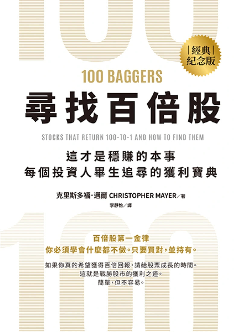 所謂的百倍股,指的是每投入1元就能獲利100元的股票。作者克里斯多福.邁爾縱覽1962年至2014年的365支百倍股研究,發現了其中的運作模式,他將告訴你如何找到這些如明星般閃耀的百倍股。你將明白,投資百倍股是人人都可成就的事。你不需要有MBA學位、或是在對沖基金公司上班的專業,只需要簡單的金融概念,還有一些能在股票與投資獲利更多的「小技巧」與技術。