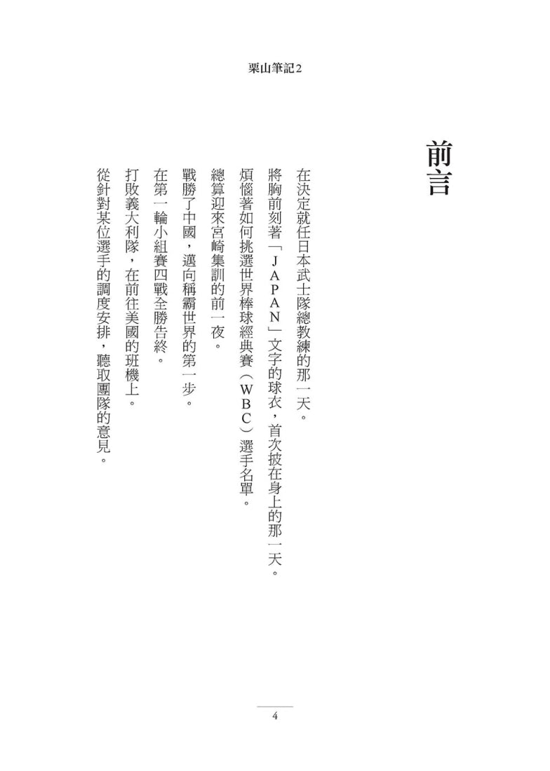 一般談到古典思想,總是給人艱深難懂,不易親近的印象。然而栗山認為,古典之所以能夠長存,代表著它們有著橫跨時代的普世價值觀,不光是作為職棒總教練,還是身而為人,都能從中獲得許多啟發。過去,他將這些話語寫在筆記裡,用來督促自己。如今,他將筆記大方公開,搭配高潮迭起的經典賽戰況,深入淺出地呈現出一部精彩感動,又值得細細咀嚼的人生指南。