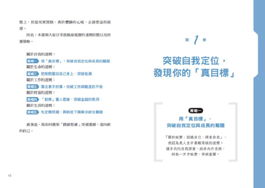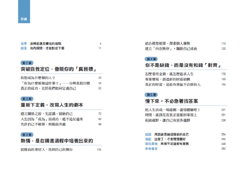 多數人經歷過的情緒起伏,她也一項都沒落下;但現實讓她明白,一個人的人生不是只關於自己,但當你勇敢踏出第一步,就自然會摸索出方向,突破關卡。低潮困頓時期,反而是探索如何成為自己的最好時機。本書將分享5個策略,幫助大家一步步蛻變,突破重圍: