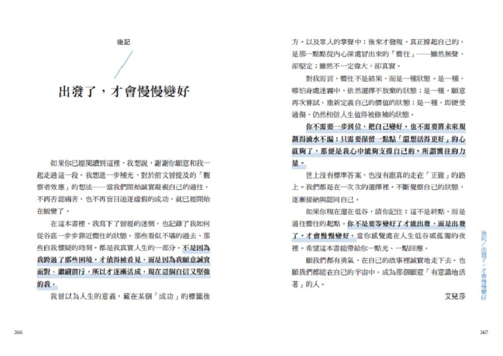 走過跌宕起伏的人生,從谷底一步步靠近嚮往的狀態,艾兒莎想跟大家分享:人生的意義不是藏在某個「成功」的標籤之後,而是在一次次的選擇裡,不斷察覺自己的狀態,逐漸接納和認同自己。我們不需要等到變好了才出發,而是先出發,才能慢慢變好。