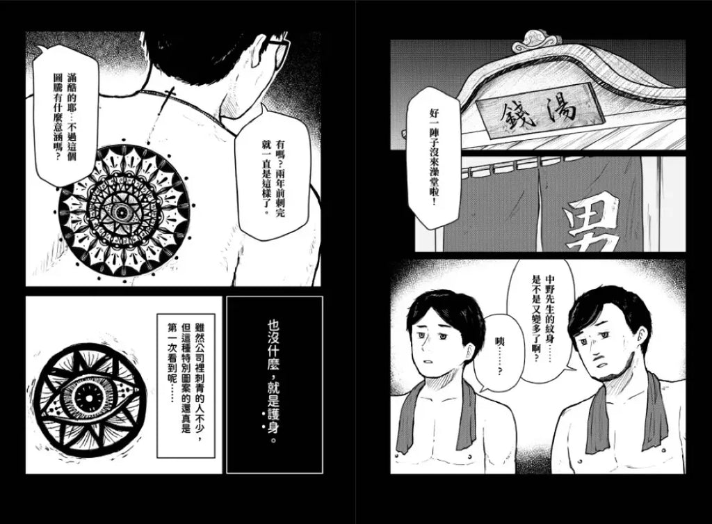 在直樹殿尚未成為怪談師之前,曾經在日本半工半讀,有一日和同事好友一起去澡堂,發現同事中野先生的身後,有一個很大的曼荼羅刺青……