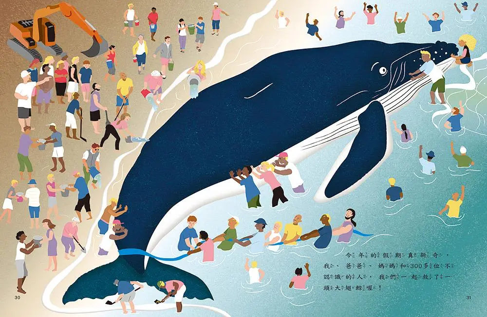 最後請來挖土機,吊起大翅鯨寶寶,順利將牠送回海中。