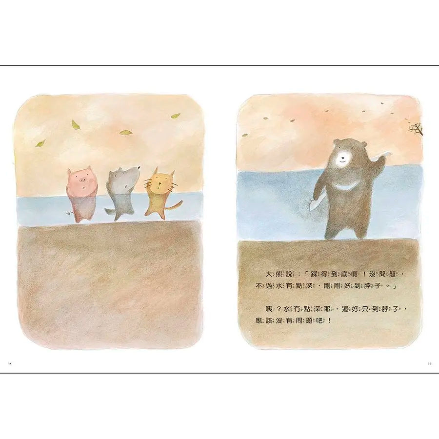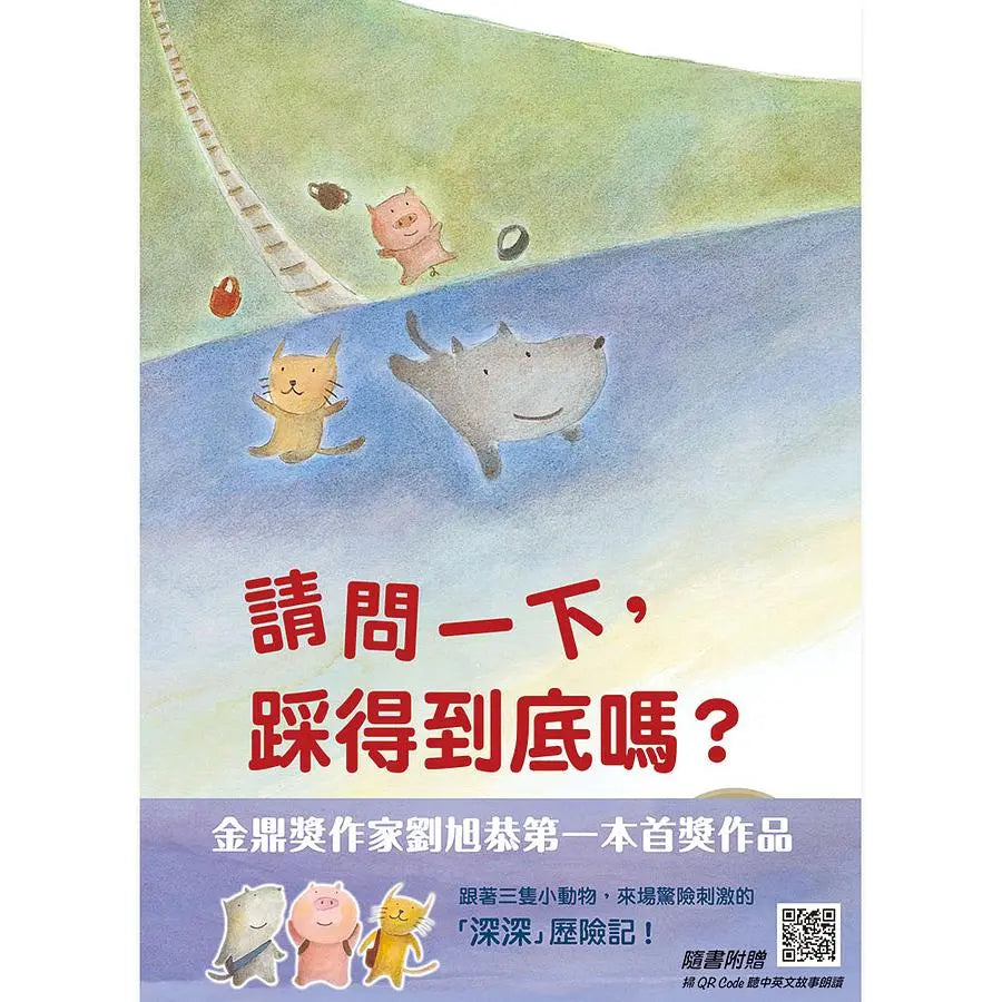 同樣的問句,詢問高矮不同的對象,卻忽略了條件差異,造成說者和聽者彼此對問題理解的誤會,誤打誤撞帶來趣味十足的戲劇效果。共讀時,可以請孩子想一想,為什麼恐龍、大象明明說踩得到底,三隻小動物卻快滅頂?觀察圖中隱含的訊息,其實早已透露主觀想像和客觀現實的具體差異。而故事中也帶入孩子正學習的概念,如深淺、大小、高低、上下等,讓孩子一邊讀,一邊隨著畫面進行探索,享受閱讀的樂趣。