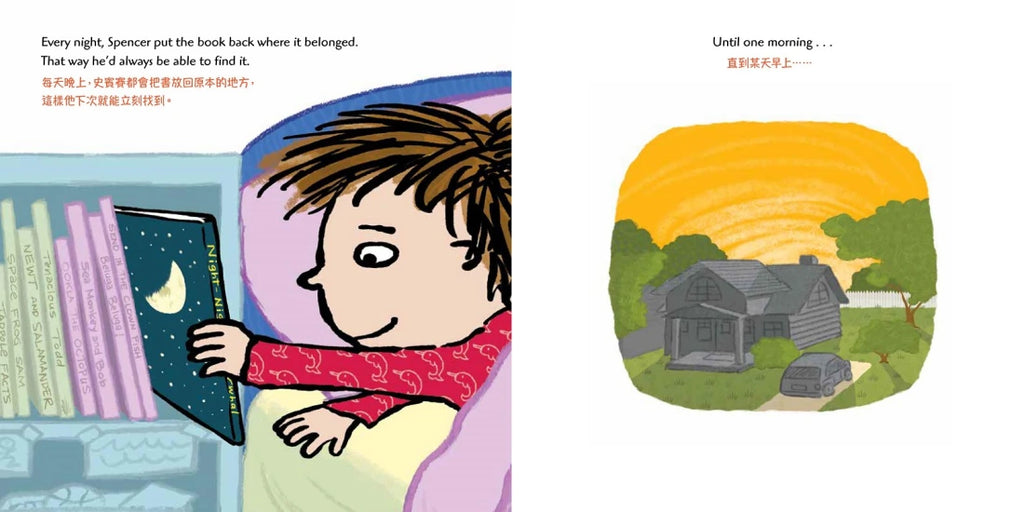 請各位聰明的小書蟲仔細觀察,史賓賽的書一本本不見之後,書架上出現了哪些東西?為什麼這些東西會出現?又會是誰留下的呢?