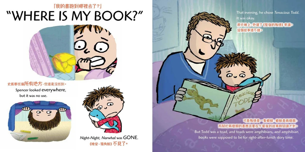某天早上起床,他最喜歡的繪本《晚安,獨角鯨》竟然不見了!