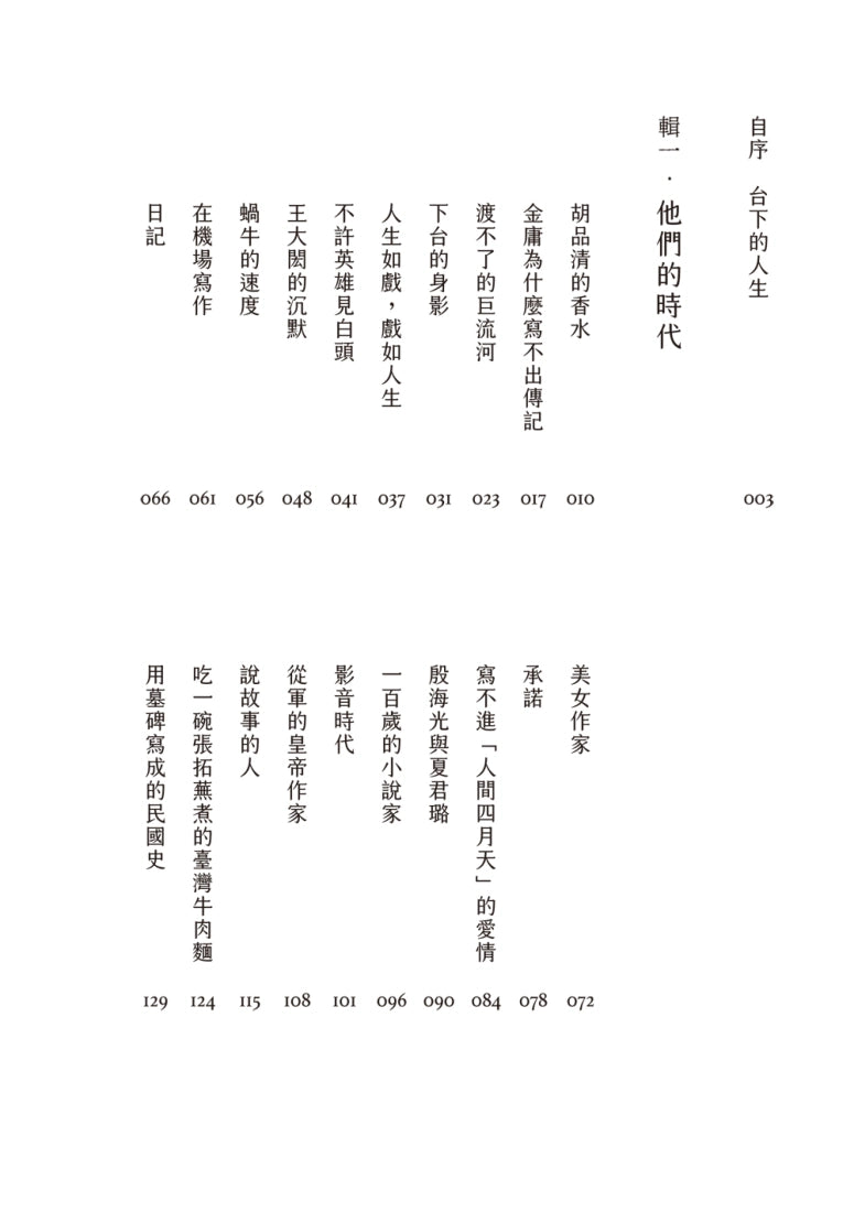 書中梭織長達六十年的臺灣藝文風雲,以及作家傳奇:金庸、平鑫濤、瓊瑤、沈君山、齊邦媛、張愛玲、林良、李碧華、張曉風、鄭清文、鍾曉陽、張拓蕪、白先勇、黃春明、二月河、章詒和、王大閎、孟小冬、郭敬明……這些「說故事的人」,在大時代裡迭宕起伏的生命;還有臺灣書店的傳奇「明目書社」賴顯邦、明星咖啡館、收書人樂伯,以及文化江湖的各種觀察,例如「灣生回家」田中實加事件等等。這些是陳宛茜多年來在藝文界耕耘、沉澱之後,為他們和他們的時代,更為我們這一代,留下紀錄。