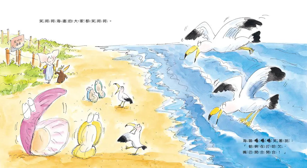 看見碰碰一臉生氣的樣子,小田鼠咚咚說:「不開心的時候就要去笑呵呵海邊。」