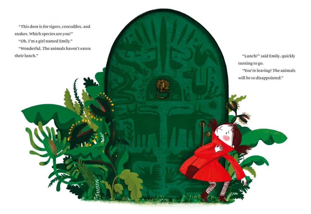 And so begins Emily's search for a door that will open. The first door is blue, and the voice behind the door tells Emily that she doesn't sound very bluish. The second door says it only opens for tigers, crocodiles, and snakes. But she is a girl named Emily-- and the animals are hungry--and so she moves on. The third is only for people who speak very quietly, and the door can hear Emily.