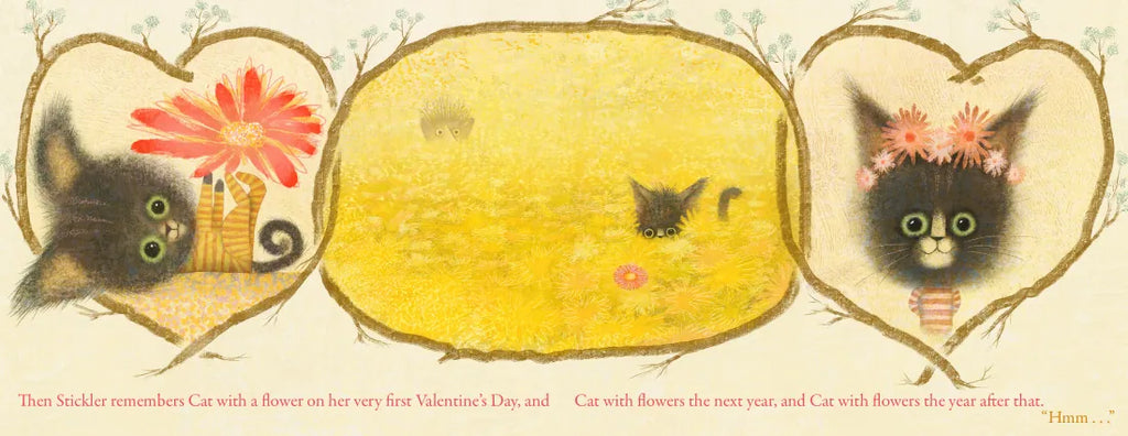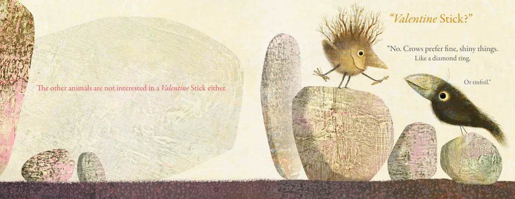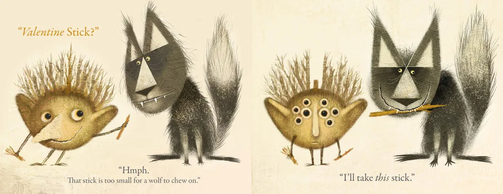 Stickler, a one-of-a-kind creature made of sticks, is giving his friends Valentine’s Day sticks, but none of them are interested in Valentine’s sticks. Crow says he prefers fine, shiny things, Beaver likes receiving funny cards, and Wolf doesn’t care for Valentine’s sticks – they’re too small to chew on! When Stickler tries to offer Cat a Valentine stick, she does not want one. “Hmm…” he wonders, “Maybe Valentine’s Day is not about what Stickler loves, but what others love.”