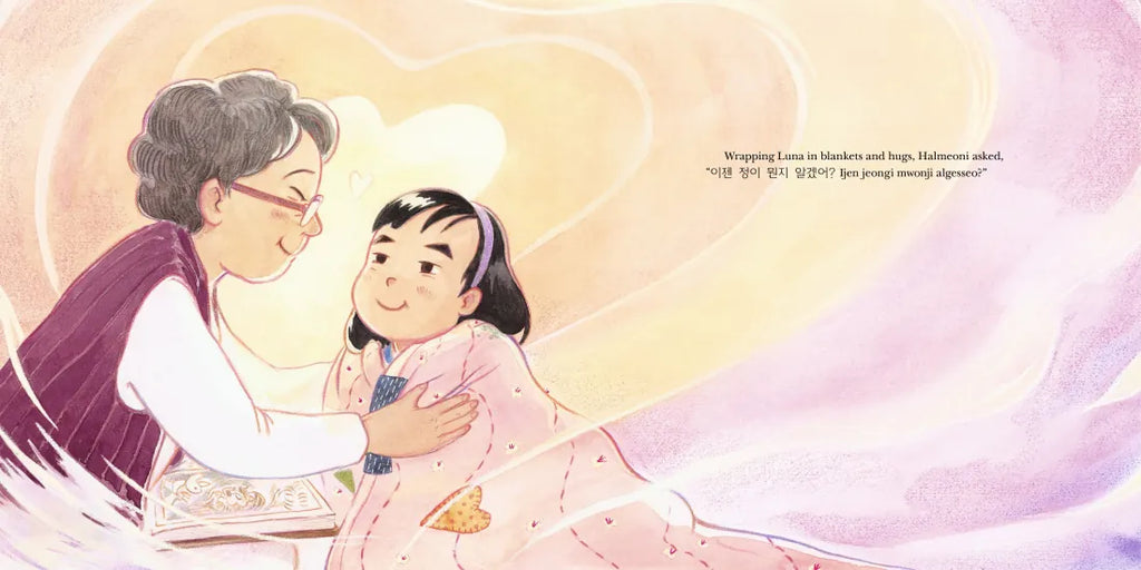 Luna loves spending time with her little brother Joey and their halmeoni after school—they share yummy treats, play at the park, and have a lot of fun speaking to each other in Korean and English. When Halmeoni notices Luna help Joey put on his shoes and says that she has “jeong,” they realize that some words aren’t quite translatable between their two languages.