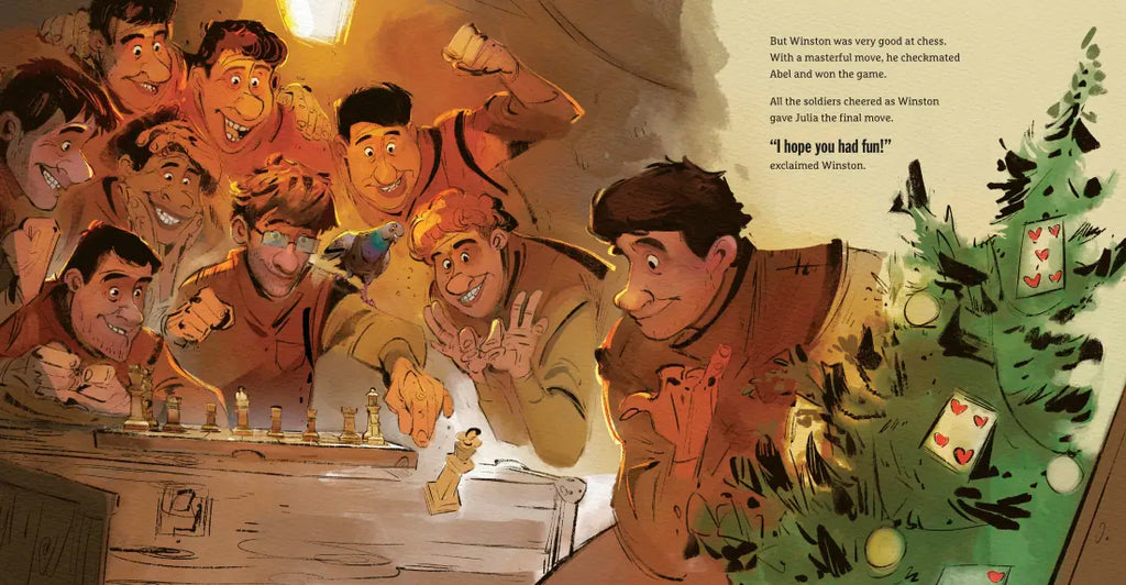Julia, a carrier pigeon, delivers messages to the battlefield. But she also has a secret mission. Even though the Red Jackets and the Great Coats are at war, Julia helps the soldiers on both sides play a special game to bring each other some joy during the holiday season.