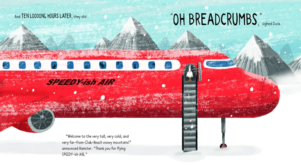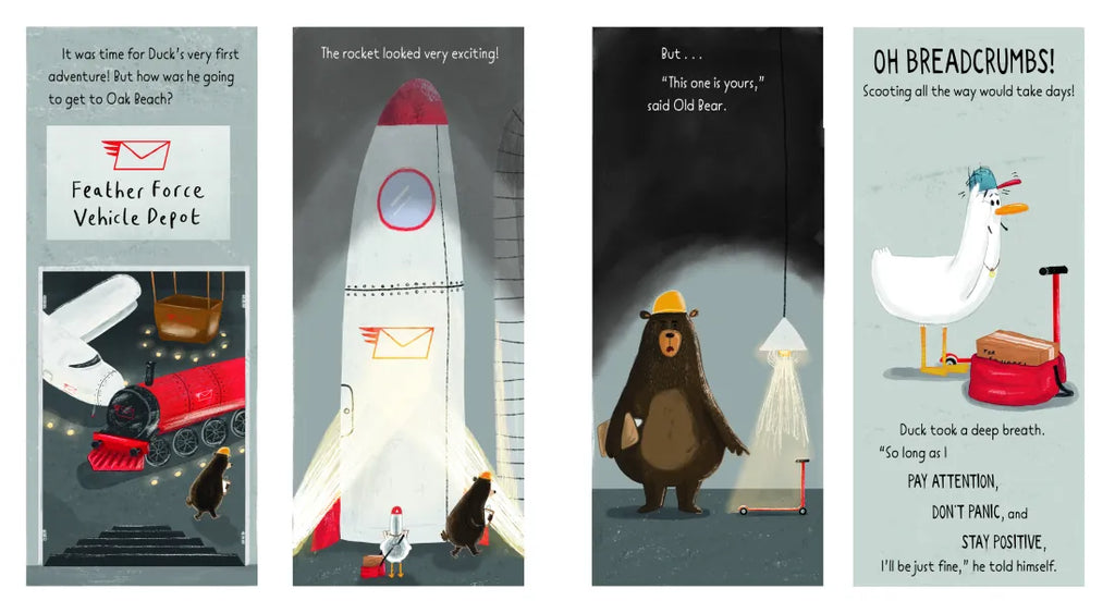 Duck is a home bird. He likes splashing in the bath, eating bread in bed, and organizing his sock collection. But there comes a time when even the most unadventurous bird must fly the coop. At least that’s what Great-Granduck says as he gives Duck his lucky compass and encourages him spread his wings. And what better way to see the world than as a … delivery duck?! With Great-Granduck’s compass and three simple rules for getting through life’s challenges – Pay attention, Don’t Panic, Stay Positive – surely Duck will be able to deliver a package to Squirrel for sunset!