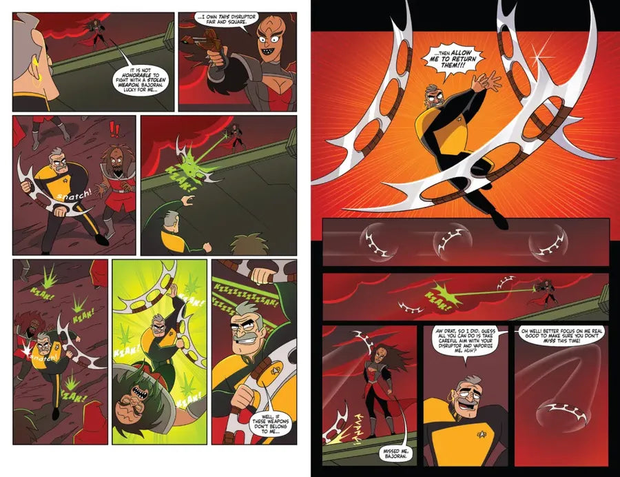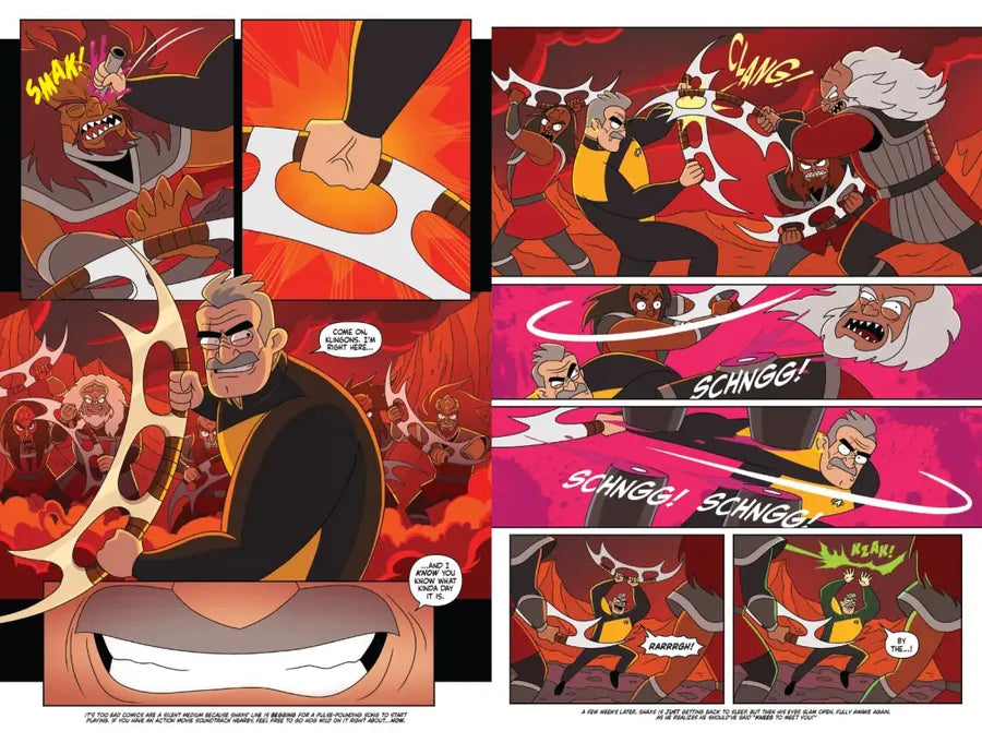 See the battle to stop the fascist, god-killing clone Kahless II from declaring war on nonfollowers across the galaxy through the eyes of the man, the myth, the legend, Lieutenant Junior Grade Shaxs! See the Bajoran’s beast-mode brawl showcasing all the behind-the-scenes Klingon-zealot butt-kicking in full animated glory!