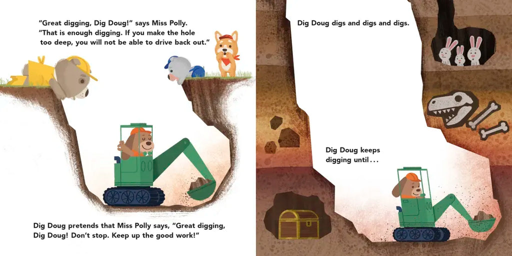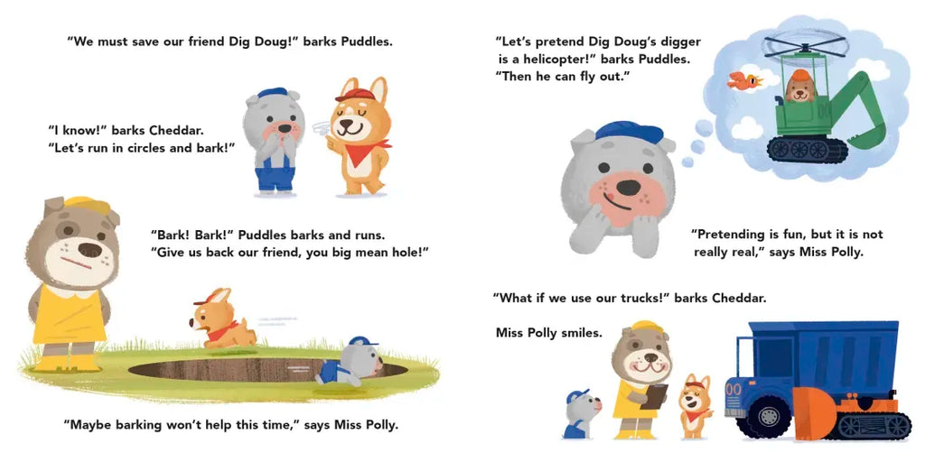 Dig Doug, Puddles, and Cheddar are ready for a big day at puppy school. Today they have an extra big project—using their construction trucks to dig a swimming pool! Dig Doug is so happy because Dig Doug LOVES to dig. But when he digs a bit too deep, his puppy friends must figure out a plan to save him.