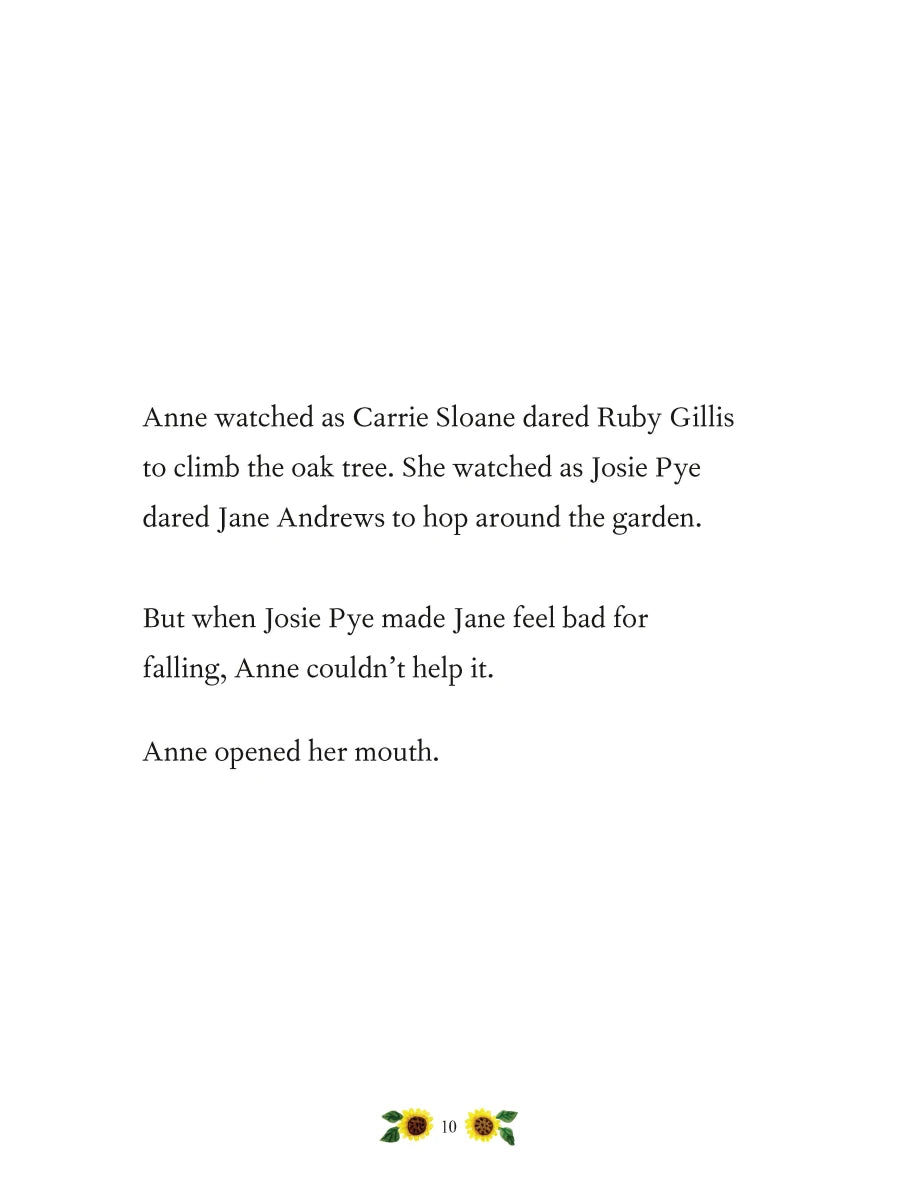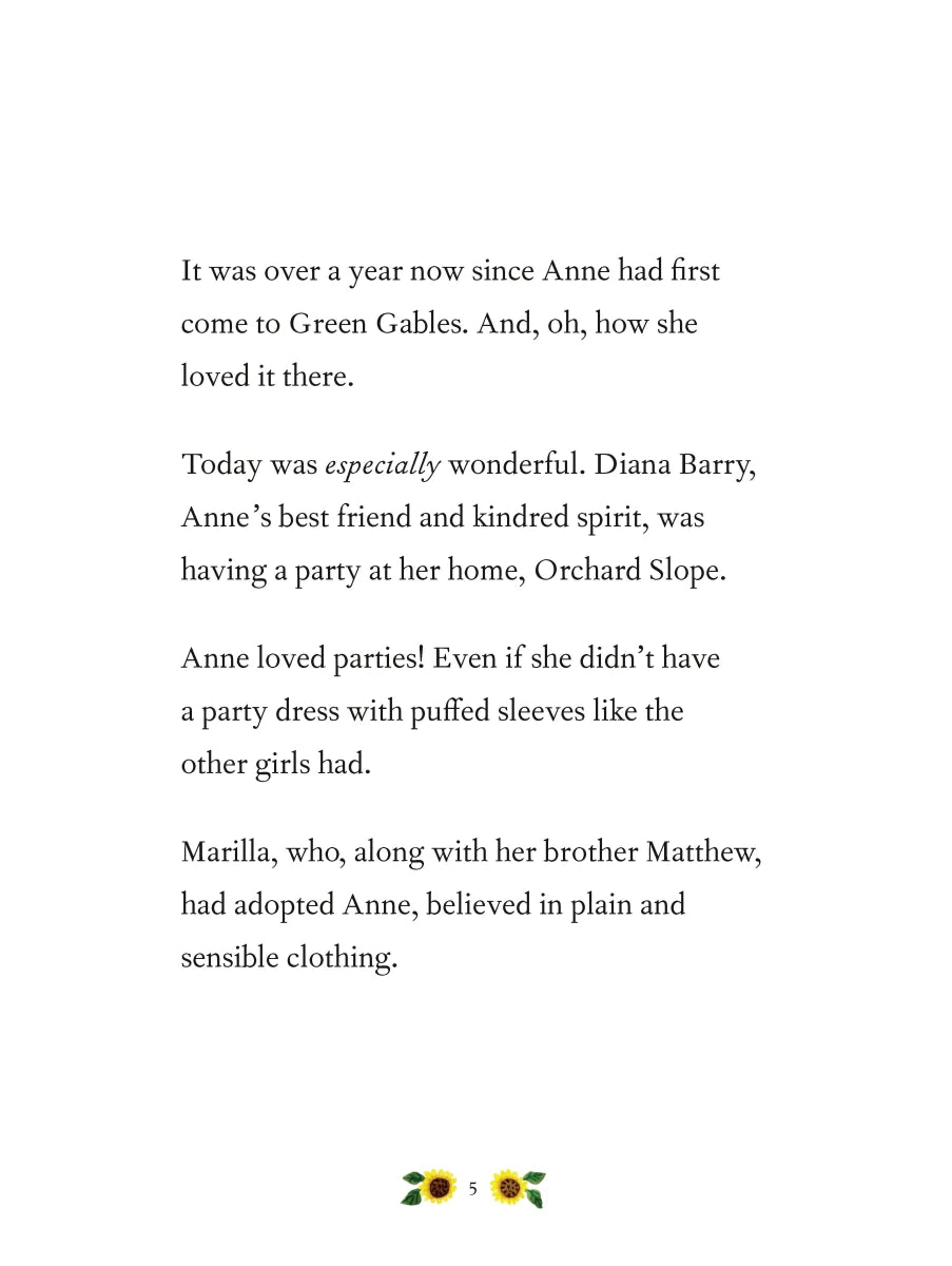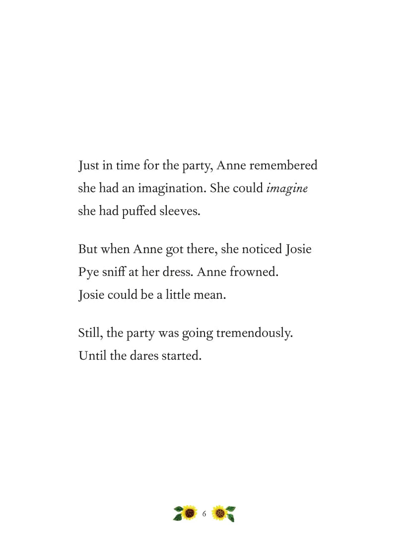 Anne is excited to be a guest at a party at Orchard Slope, the home of her kindred spirit, Diana Barry. But when the dares start and mean Josie Pye makes the others feel bad, Anne can't stop herself from challenging Josie to a dare . . . which leads to Anne being dared to climb the house and walk along the ridgepole! Anne's dangerous dare ends in injury . . . and teaches her an important lesson. But Anne must pluck up her courage again when she is chosen to recite at a Christmas concert! How can Anne perform in front of so many people? And what is shy Matthew Cuthbert hiding from the family?