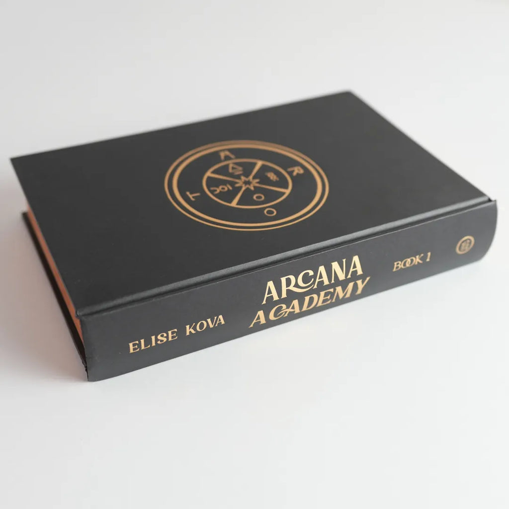 The dazzling first edition hardcover of Arcana Academy will feature gold foil page edges, designed endpapers, two interior black-and-white maps, a custom-stamped case, and a premium dust jacket with foil—while supplies last!