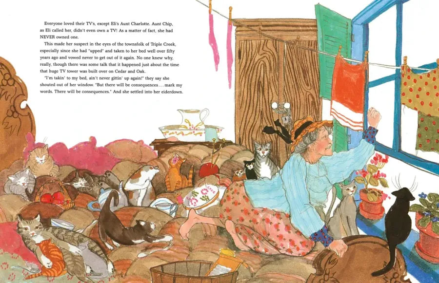 Everyone in Triple Creek loves TV. Everyone, that is, except for Eli's Aunt Chip, who doesn't even own one. In fact, the townspeople love their TVs so much that Aunt Chip has taken to bed in protest for the past fifty years!