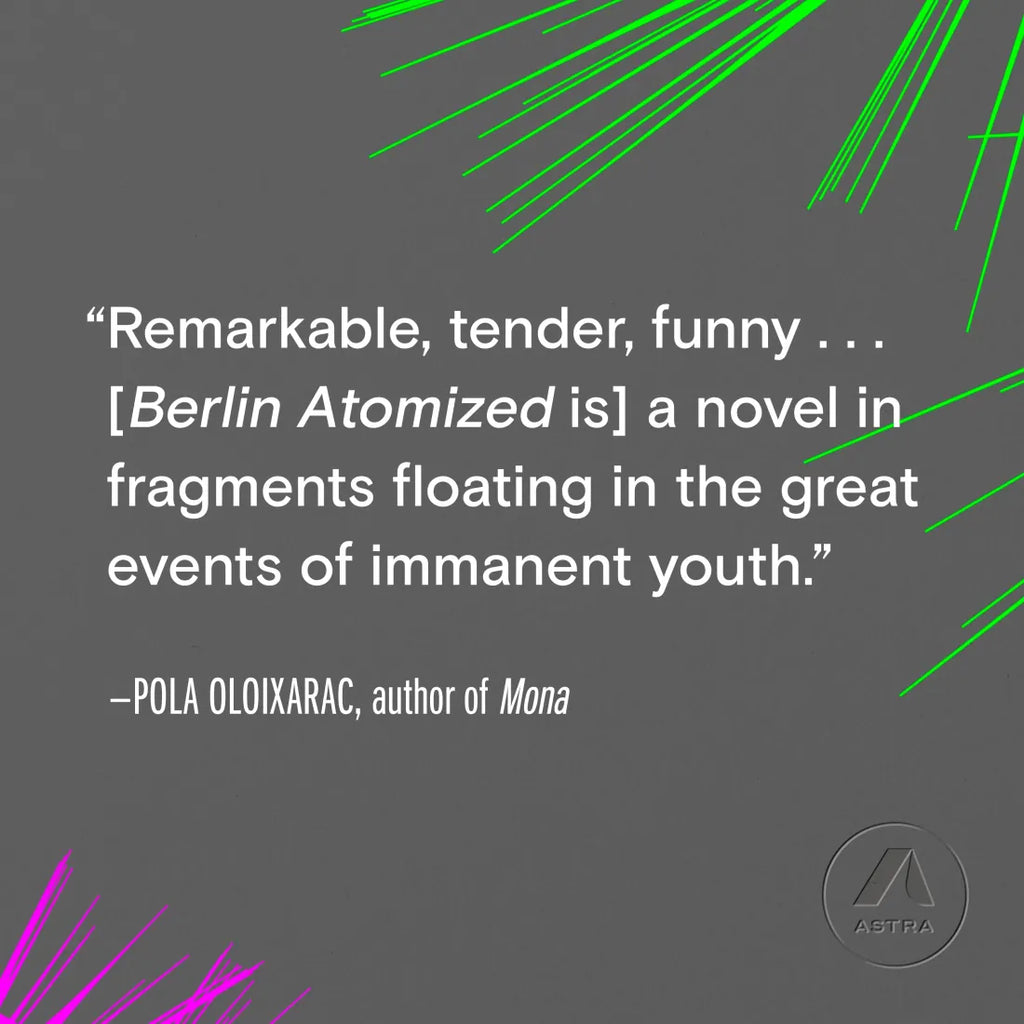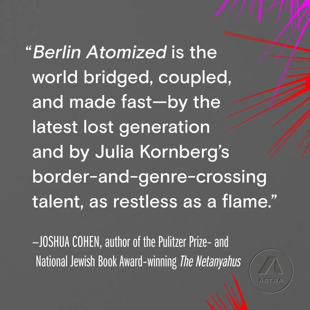 "Berlin Atomized is the world bridged, coupled, and made fast—by the latest lost generation and by Julia Kornberg's border-and-genre-crossing talent, as restless as a flame." —Joshua Cohen, author of the Pulitzer Prize and National Jewish Book Award winning The Netanyahus