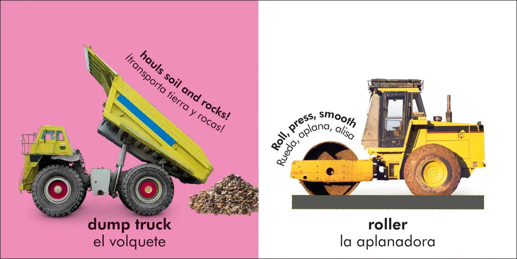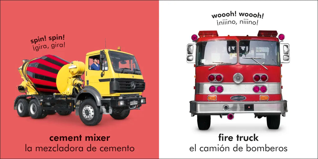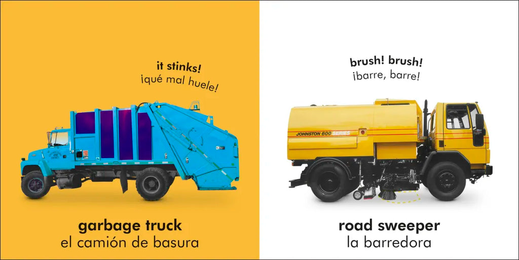 ¡El libro interactivo perfecto para que los bebés aprendan los nombres de los camiones en dos idiomas!