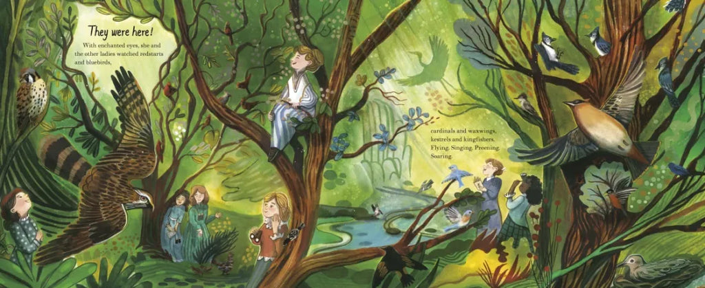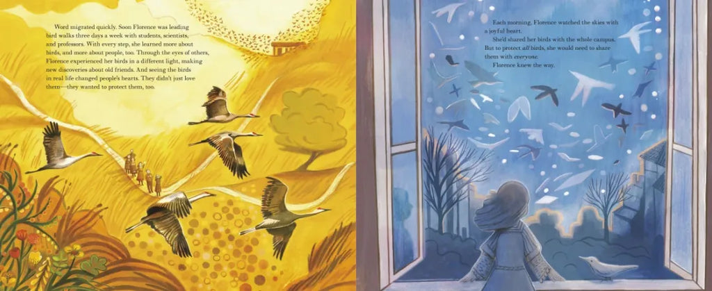 But Florence changed all that. A bird-lover since childhood, she wanted to show the world what made these creatures special. She wanted everyone to care as much as she did, and so she taught classes, printed pamphlets, and eventually began leading bird walks so people could see it with their own eyes. Over time, they did see! With hard work and perseverence, Florence changed the way we look at birds, inspiring millions to follow in her footsteps on bird walks of their own.