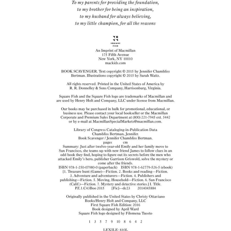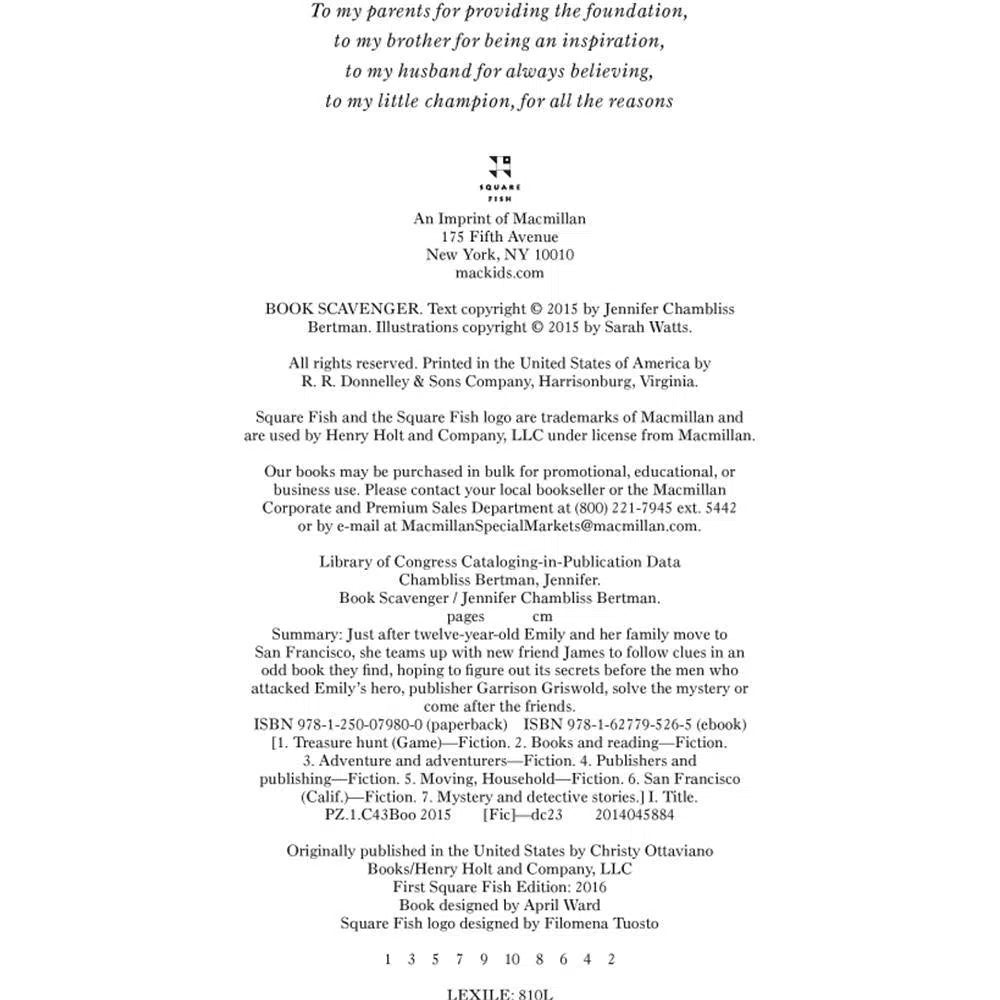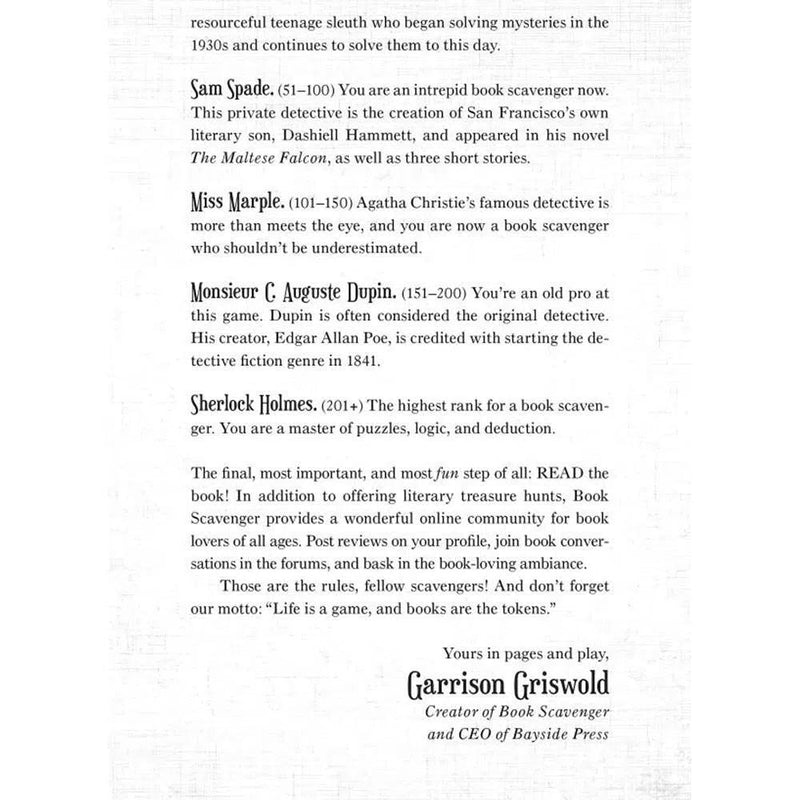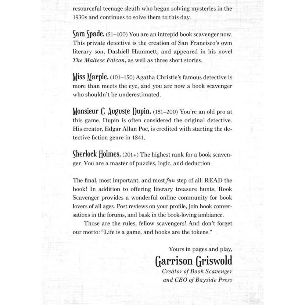 For twelve-year-old Emily, the best thing about moving to San Francisco is that it's the home city of her literary idol: Garrison Griswold, book publisher and creator of the online sensation Book Scavenger (a game where books are hidden in cities all over the country and clues to find them are revealed through puzzles). Upon her arrival, however, Emily learns that Griswold has been attacked and is now in a coma, and no one knows anything about the epic new game he had been poised to launch. Then Emily and her new friend James discover an odd book, which they come to believe is from Griswold himself, and might contain the only copy of his mysterious new game.