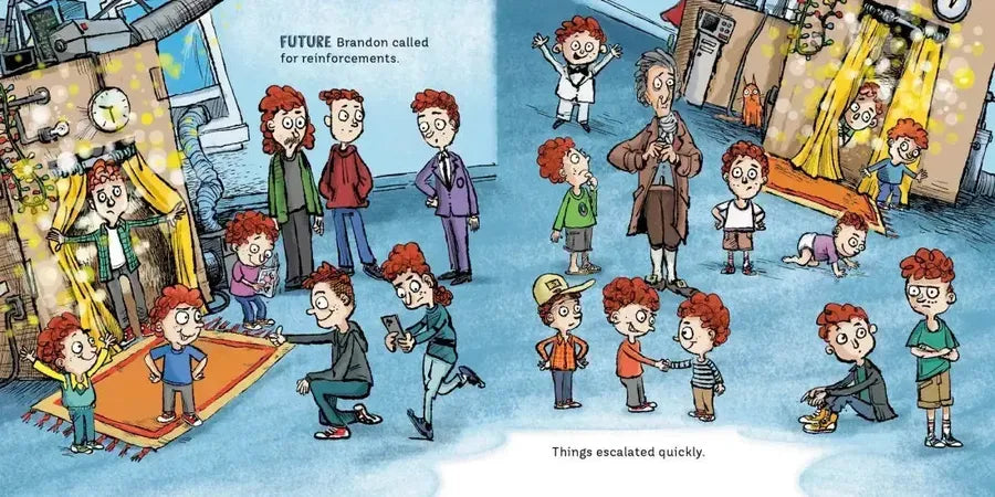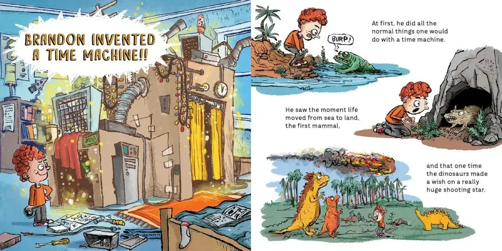 Now, he can visit super cool moments in world history (as well as family history). But what Brandon really wants to do with his time machine is FIX HIS HOMEWORK. (He might have done poorly because he was busy building his time machine.)