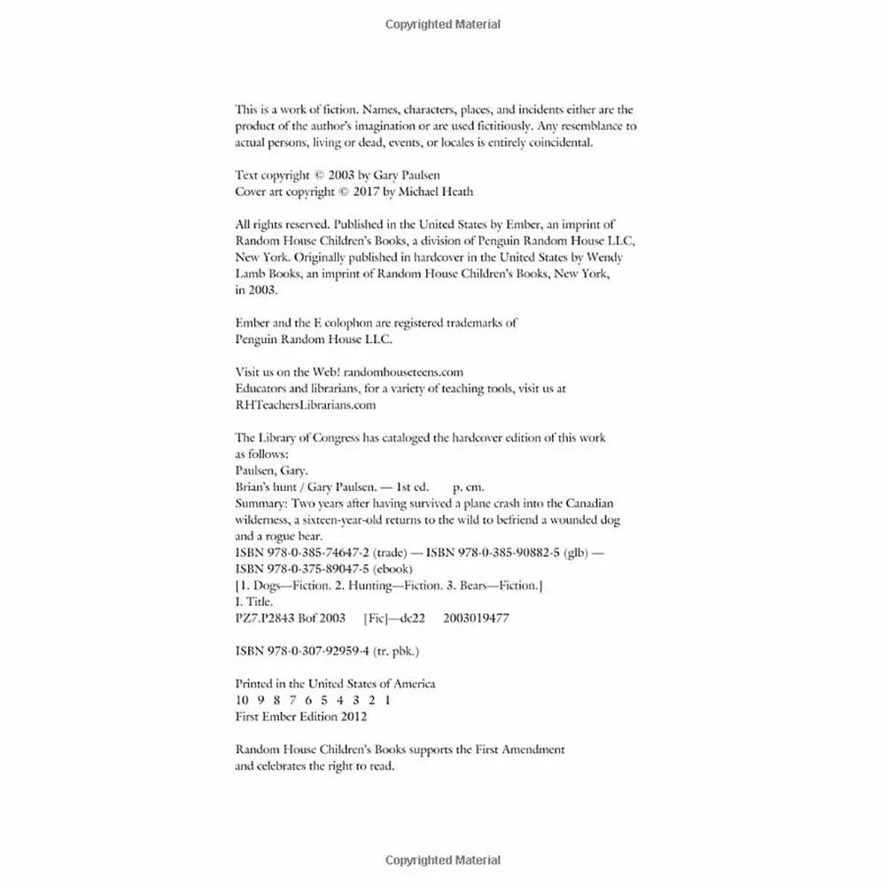 Brian Robeson has stood up to the challenge of surviving the wilderness in Hatchet, The River, Brian's Winter, and Brian's Return. Now, while camping alone on a lake in the woods, he finds a wounded and whimpering dog. As Brian treats her wounds, he worries about who or what did this to her. His instincts tell him to head north, quickly, to check on his Cree friends. With his new companion at his side, he sets out on the hunt.