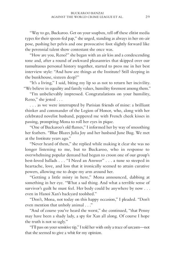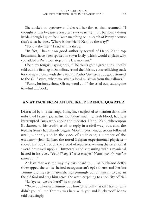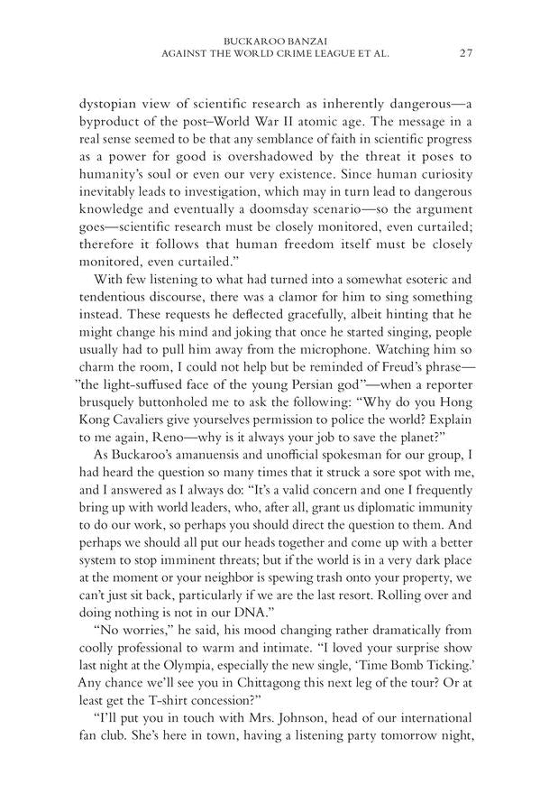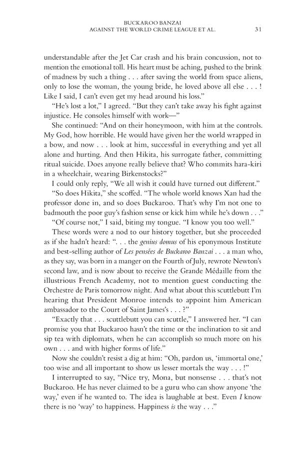 Still mourning the losses of his beloved Penny Priddy and his surrogate father Professor Hikita, Buckaroo Banzai must also contend with the constant threat of attack from his immortal nemesis Hanoi Xan, ruthless leader of the World Crime League. To make matters worse, Planet 10 warrior queen John Emdall has sent her Lectroid legions against Earth with a brutal ultimatum. Or is her true target Buckaroo Banzai? As the apocalyptic threats continue to mount, only Buckaroo and his Hong Kong Cavaliers stand in the way of global destruction.