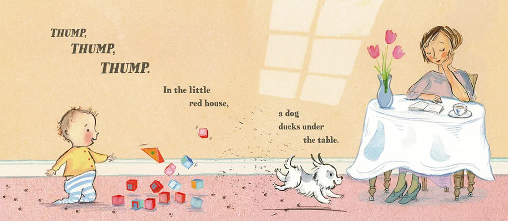 In the little red house, Buster the dog ducks under the table. He waits and watches and waits some more as his heart goes thump, thump, thump. And then ... CHAAA! Out of the shadows comes the baby, squealing and whirling and bumping his nose! Go Buster! Go, Buster! Go!