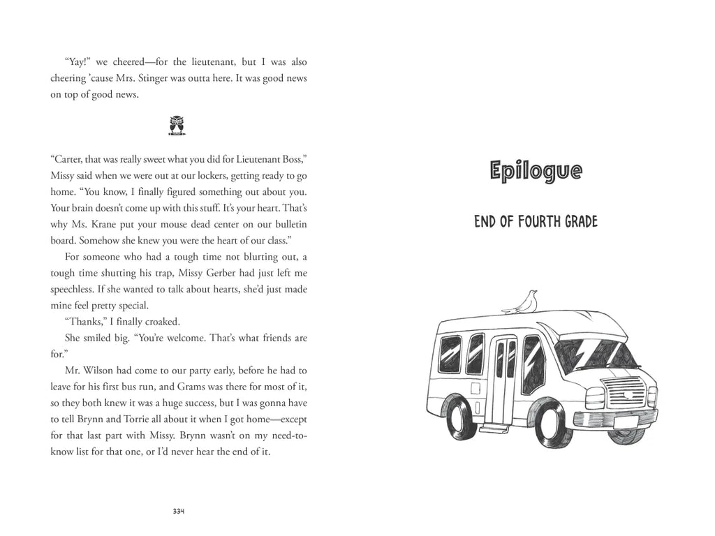 But the Owl knows just how to handle Carter’s energy, showing his classmates another side of him. Everything’s looking up until Carter finds out that some people would like to see Ms. Krane replaced. The news spurs him on a secret mission to save his teacher. Then a disruption, heated words with Missy, and trouble outside of school test Carter’s plan, heart, and courage, as he navigates an especially tricky school year.