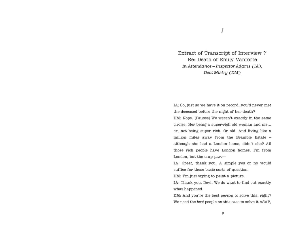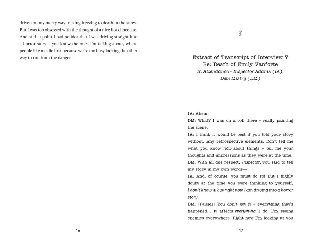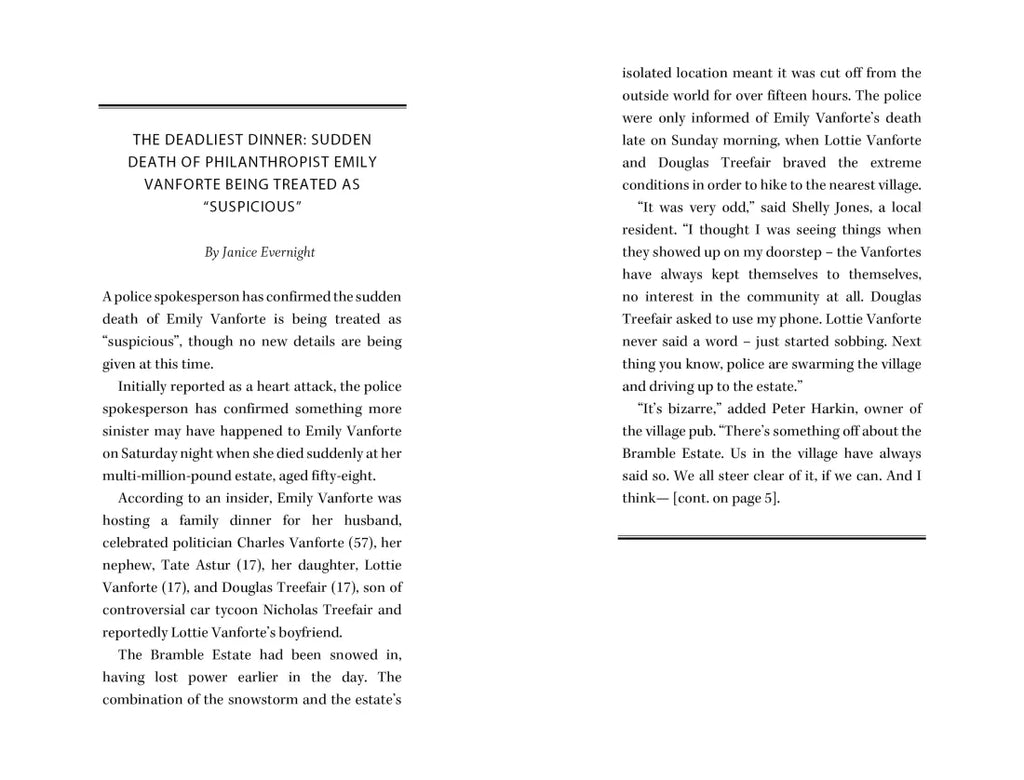 When three girls are stranded at the grand Bramble Estate in the middle of a snowstorm, they stumble into a murder plot. Someone has poisoned wealthy Emily Vanforte in the middle of a family dinner - which means Devi, Lizzie and Jayne are trapped in the house with a killer and a mystery to solve. With knives under floorboards, vanishing guns and secret passages in the walls, no one is safe and everyone is a suspect. But in a house of liars and corruption, will the girls save themselves...or learn to fit in?