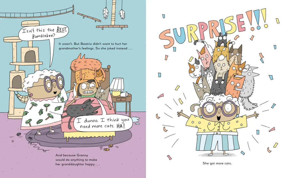 So Bea comes up with a plan to keep Granny company during the week: a cat! Granny is a little confused because she doesn't remember mentioning that she likes cats, so she asummes that Bea must want a cat around when she visits. And in doting grandmother fashion, “what’s better than one cat?” she reasons—more cats!