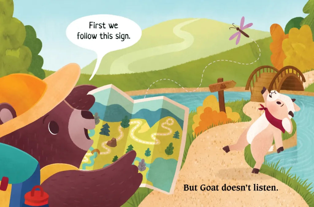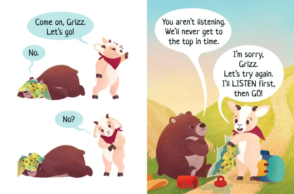 Goat and Grizz (grizzly bear cub) are off on a hike, but Goat doesn't listen to Grizz's directions. Each time Goat ends up in the wrong place, Grizz has to rescue Goat. Time ticks away as they try to make it to the top of the mountain by sunset. When Grizz gives up in frustration, Goat realizes it’s important to listen.