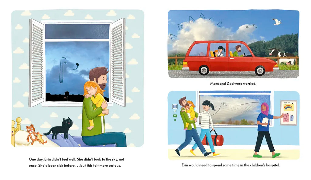 Erin’s favourite game is spotting animals in the clouds with her mum and dad - everything from foxes and polar bears to little rabbits! She calls them her 'cloud babies'. One day, Erin falls very ill. She has to spend a long time in hospital but she still manages to find comfort and joy in spying cloud babies through the windows with her new hospital friends.