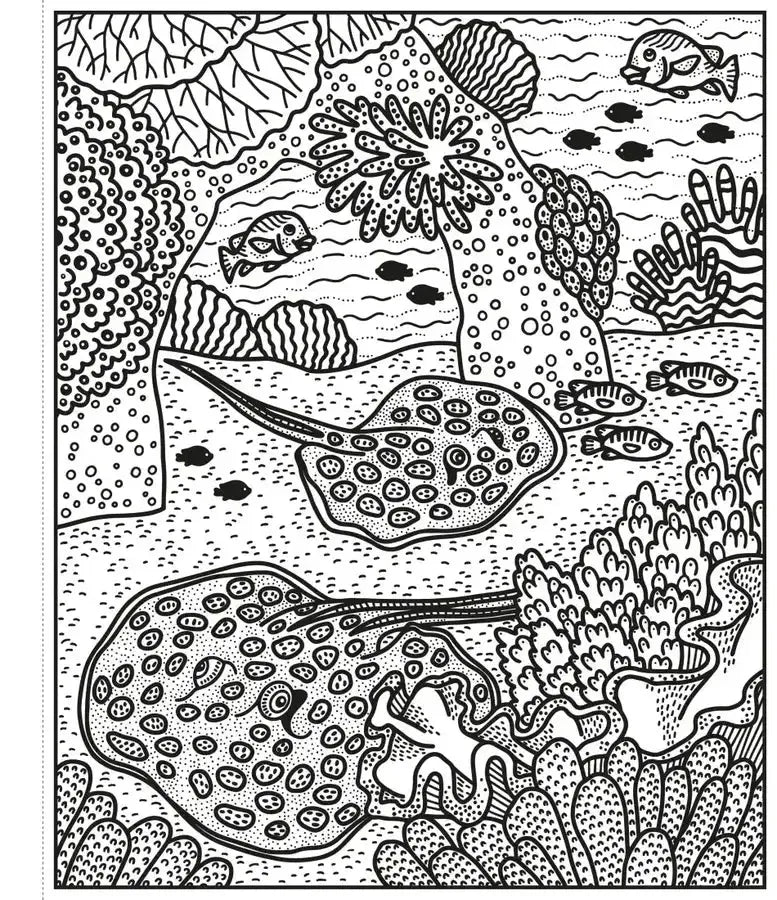 Packed with fascinating scenes showing fish, turtles and other sea creatures swimming among beautiful corals. Simply brush water over the black and white designs to reveal an array of glorious colours.