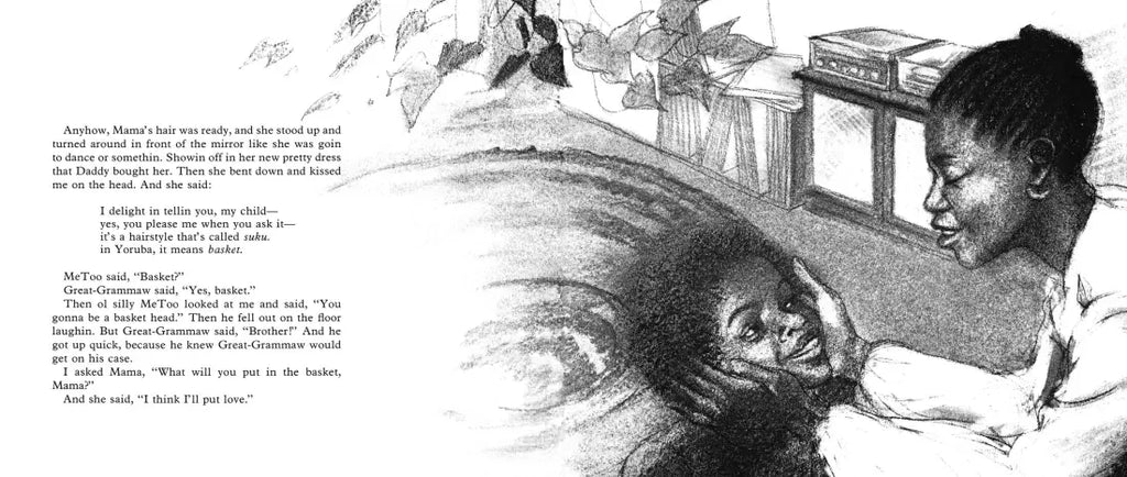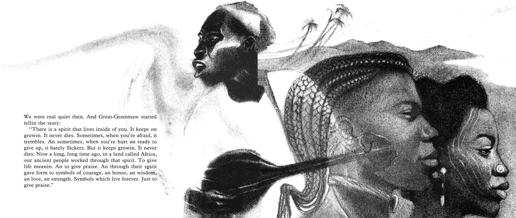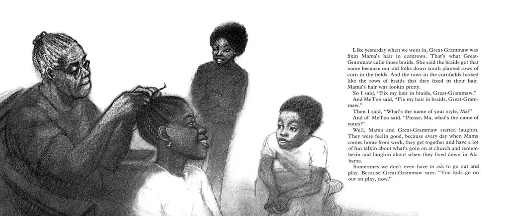 Every design has a name and means something in the powerful past and present richness of the Black tradition. Mama's and Great-Grammaw's gentle fingers weave the design, and their lulling voices weave the tale, as they braid their children's hair into the striking cornrow patterns of Africa.