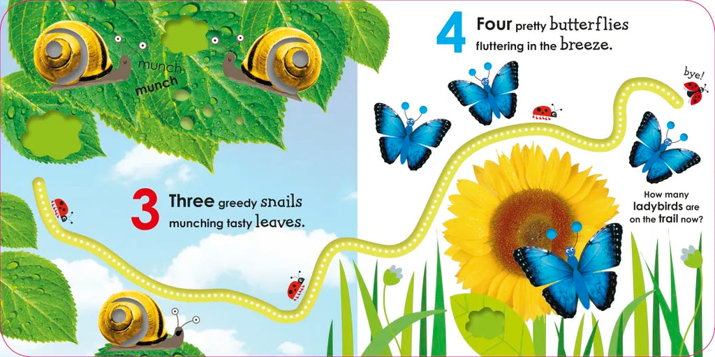 Twelve bright pages feature an animal-packed number rhyme to read aloud. From one little ladybug to ten noisy ducklings, preschoolers will soon be counting the garden friends as they follow the tactile trails, feel the intriguing die-cut pictures, and embark on an animal adventure. Dazzling dragonflies, greedy snails, pretty butterflies, wriggly caterpillars, green grasshoppers, little bunnies, buzzy bees, and tiny ants are all waiting to be counted in this delightful book, and as you turn each page, there are more and more little ladybugs to count, too! The lively rhyming verse aids language development and literacy, while following the finger trails and exploring the tactile pages encourages fine motor skills--helpful for pre-writing readiness.