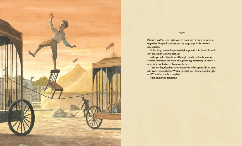 When the Great Blondin announced that he was going to walk from America to Canada across the Niagara River on a rope that was more than 1,100 feet long and just 3 inches wide, hanging 160 feet above the raging river, people came from everywhere. Some came to watch him cross. Some came to watch him fall. Some thought he wouldn’t show up at all. But he did show up. And he did walk across the river. And then he did something else amazing. He crossed the river on that tightrope again and again, adding another death-defying flourish each time. Matt Tavares’s gorgeous, riveting account of the daredevil of Niagara Falls is sure to hold readers in its grip, just as Blondin's feats enthralled those spectators on the cliffs more than one hundred and fifty years ago.