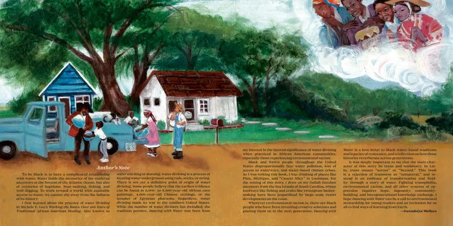 As soon as Kit’s old enough to ride in Grandpa's truck, they begin joining him to dig wells for their community. Grandpa is magic. He can feel the weather in his bones, and he’s able to dance with water. With just a tree branch in his hand, Grandpa sways and spins over the land until he finds a spot to dig a hole into the waiting earth. When the water springs up, Grandpa and Kit jump for joy.