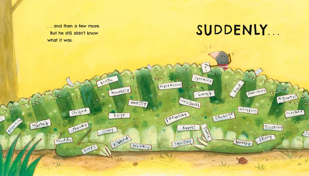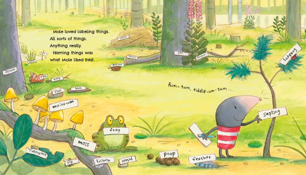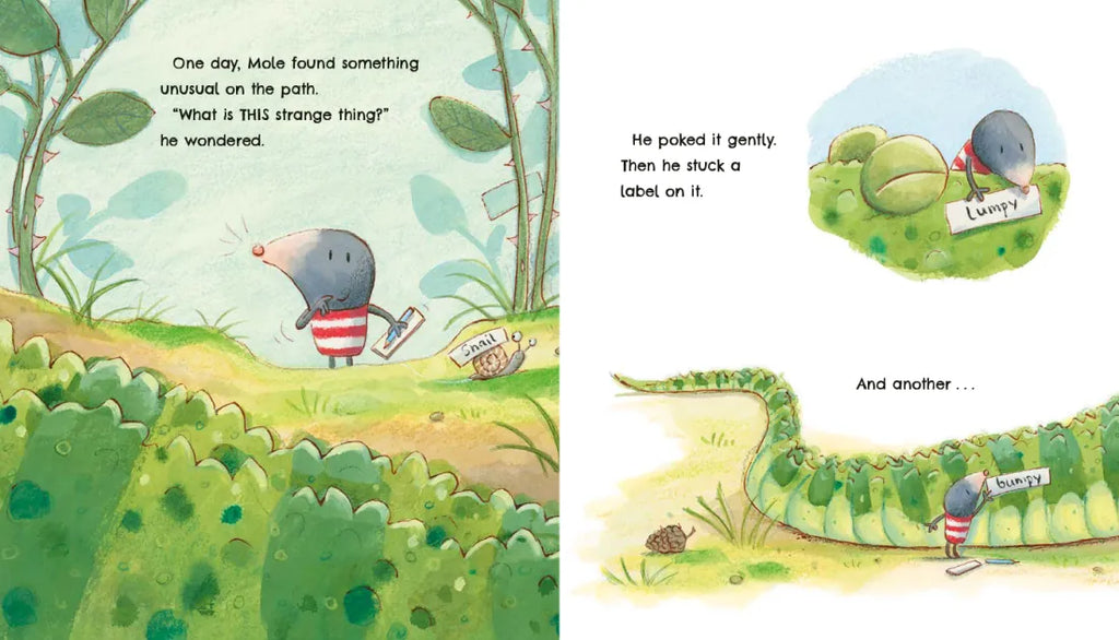 Mole loves to stick labels on objects. One day, he finds something unusual in the woods. He puts a bunch of labels on the beast that read, lumpy, bumpy, gigantic. Then the thing frightens Mole, so Mole adds the label "dangerous". But is the Lumpy-Bumpy Thing really all that dangerous?