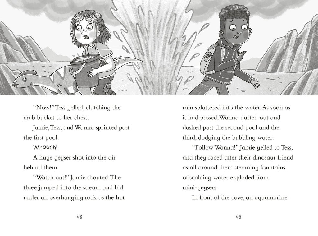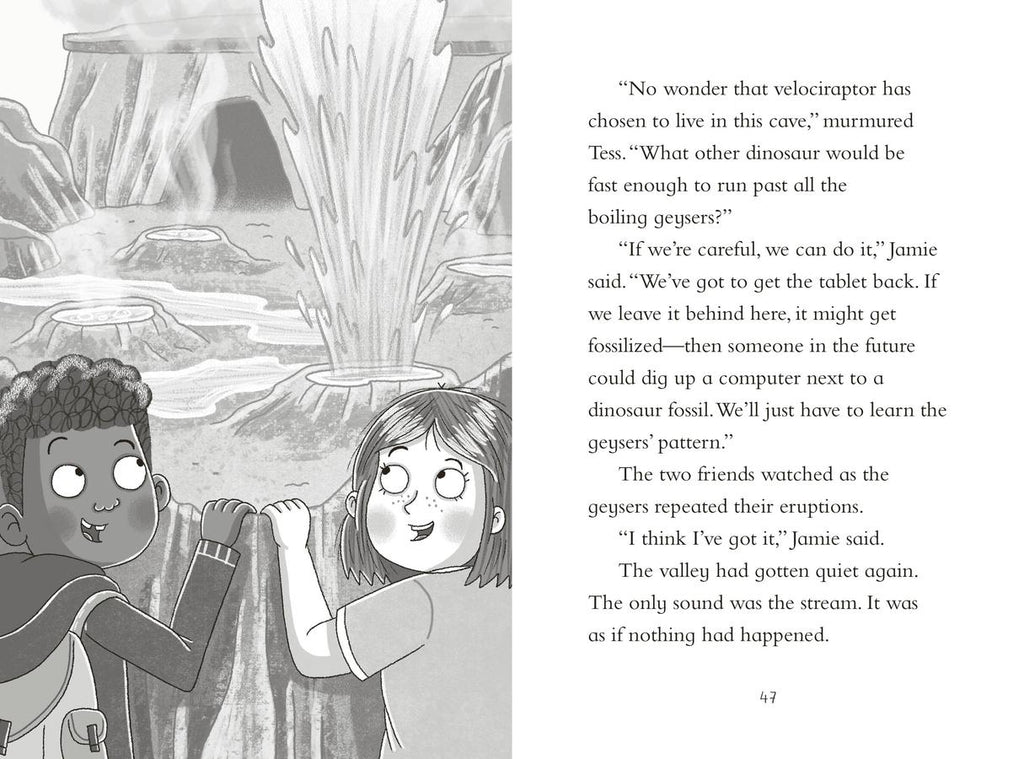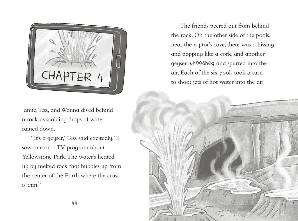 Meet Jamie, a member of the Dinosaur Club. They are a network of kids around the world who love to share dinosaur knowledge, help identify fossils, post dino discoveries, and chat about all things prehistoric. Jamie has just moved to Ammonite Bay, a stretch of coastline famous for its fossils. He is busy exploring when he discovers some dinosaur footprints and is transported back to the time of the dinosaurs! It sounds like Jamie needs some help from the Dinosaur Club when he comes across a sneaky velociraptor that steals his tablet!