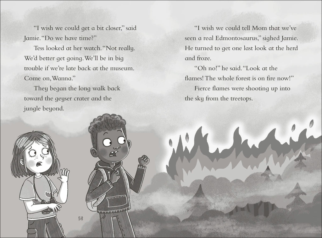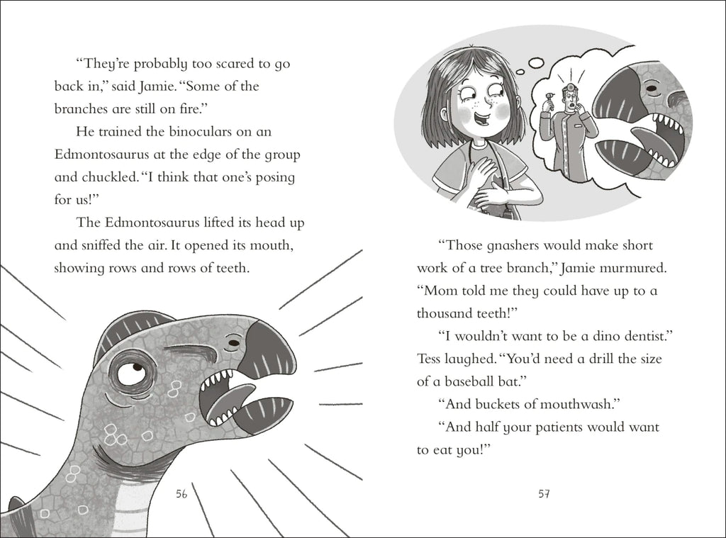 Meet Jamie, a member of the Dinosaur Club. They are a network of kids around the world who love to share dinosaur knowledge, help identify fossils, post dino discoveries, and chat about all things prehistoric. Jamie has just moved to Ammonite Bay, a stretch of coastline famous for its fossils. He is busy exploring when he discovers some dinosaur footprints and is transported back to the time of the dinosaurs! It sounds like Jamie needs some help from the Dinosaur Club when he meets the hungry herbivore Edmontosaurus and gets caught in a stampede!