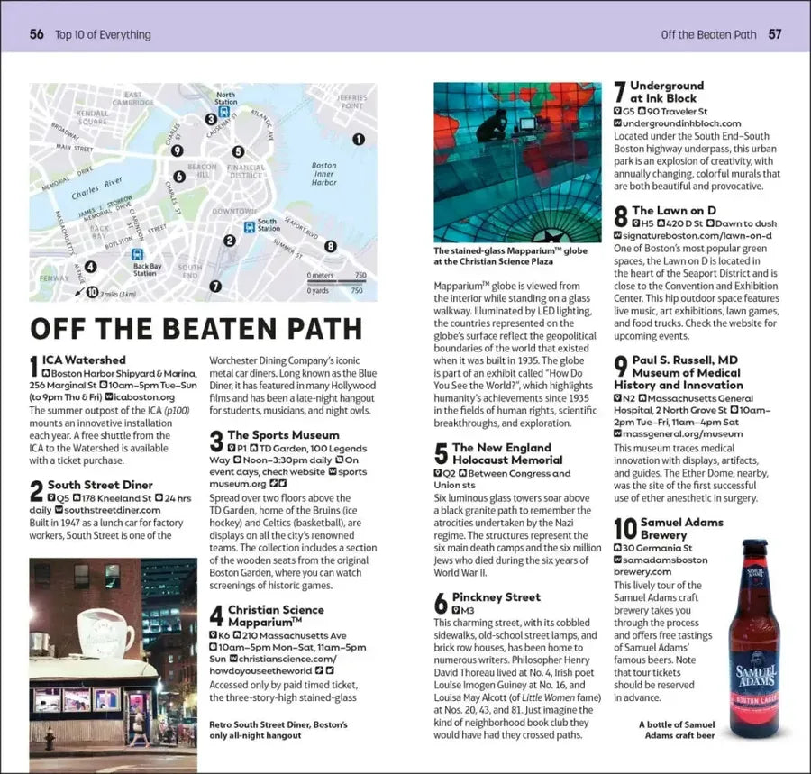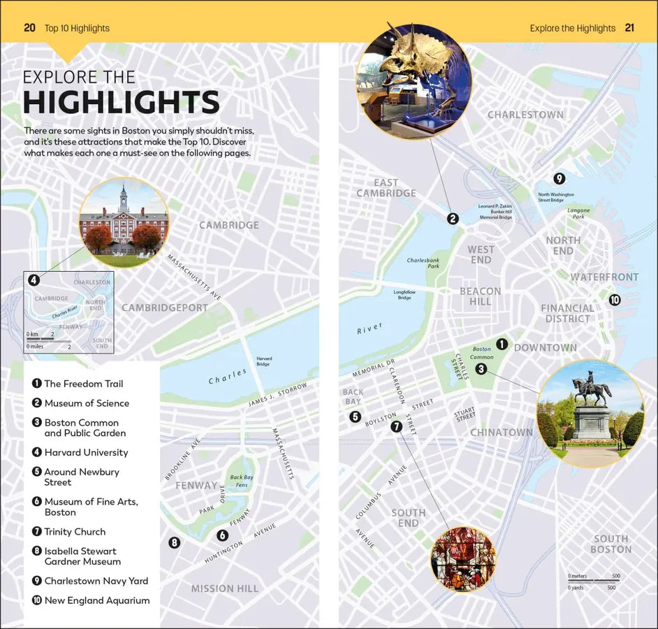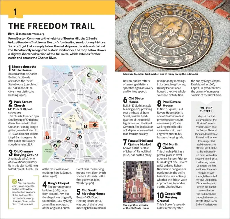 • Top 10 lists of Boston's must-sees and must-dos, including walking along the Freedom Trail, visiting the Museum of Science and wandering the grounds of Harvard University