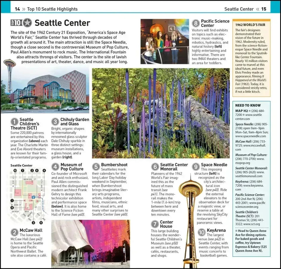 - Top 10 lists of Seattle's must-sees, including Pike Place Market, Discovery Park, Seattle Center, Pioneer Square, and the waterfront