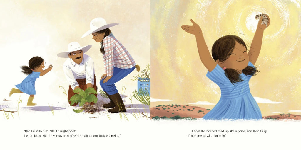 When a girl finds a horned toad among the rain-starved squash, tomatoes, and poblanos on her family's Texas farm, her Pa tells her that, if she kisses it on the head -- blech! -- she gets to make one wish. What will she wish for?