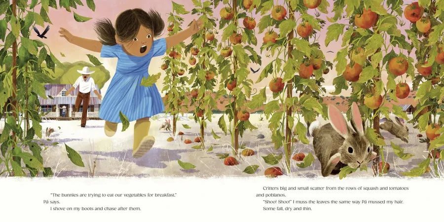 The girl sees the worry lines on Pa's face getting deeper. She knows she has to do something to help. And so, thinking about the people who lived on this land before her, and all those who will live on it after her, she wishes for rain.