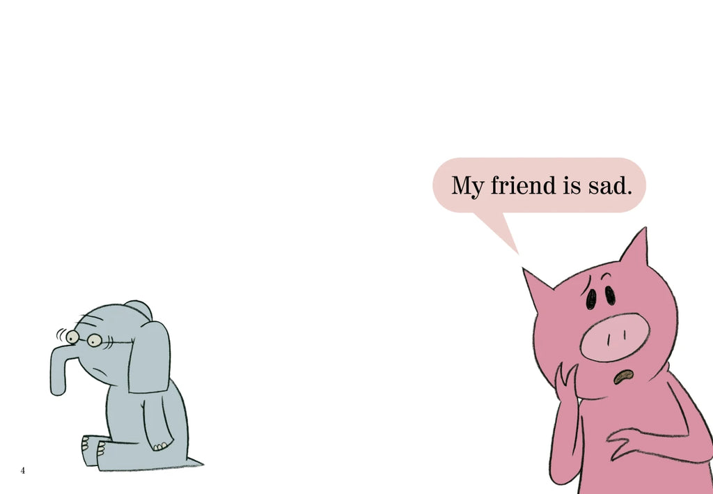 In My Friend is Sad, Elephant Gerald is down in the dumps. Piggie is determined to cheer him up by dressing as a cowboy, a clown, and even a robot! But what does it take to make a sad elephant happy? The answer will make even pessimistic elephants smile.